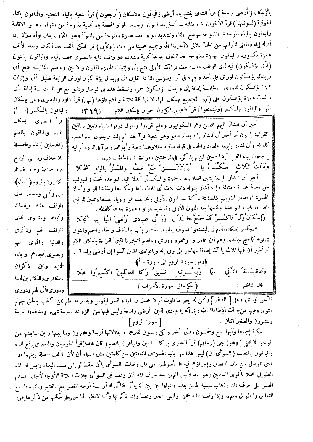 أخبر أن المشار إليهم بحصن وهم الكوفيون ونافع قرءوا ويقول ذُوقُوا [العنكبوت: 55] بالياء فتعين للباقين القراءة بالنون ثم أخبر أن المشار إليه بصاد صفو وهو شعبة قرآ هنا (ثم إلينا يرجعون) [العنكبوت: 57] بياء الغيب كلفظه وأن المشار إليهما بالصاد والحاء في قوله صافيه حللا وهم شعبة وأبو عمرو قرآ في الروم ثُمَّ إِلَيْهِ يُرْجَعُونَ [العنكبوت: 17] بياء الغيب أيضا فتعين لمن لم يذكره في الترجمتين القراءة بتاء الخطاب فيهما.