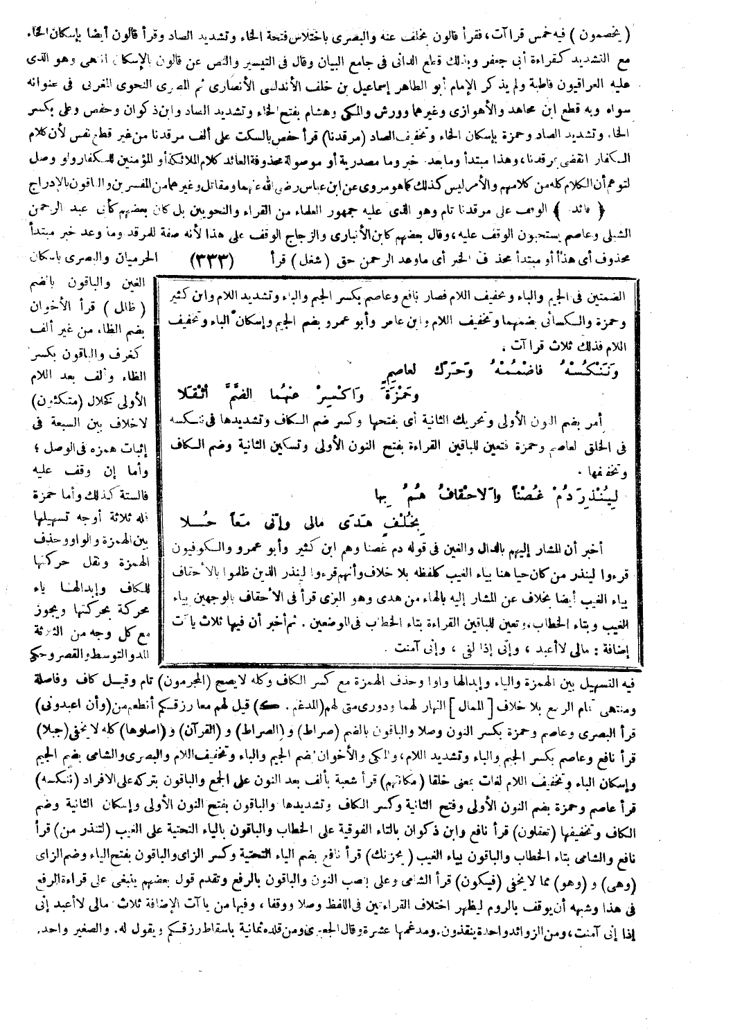 أخبر أن المشار إليهم بالدال والغين في قوله دم غصنا وهم ابن كثير وأبو عمرو والكوفيون قرءوا لِيُنْذِرَ مَنْ كانَ حَيًّا [يس: 70]، هنا بياء الغيب كلفظه بلا خلاف وأنهم قرءوا لِيُنْذِرَ الَّذِينَ ظَلَمُوا [الأحقاف: 12] بياء الغيب أيضا بخلاف عن المشار إليه بالهاء من هدى وهو البزي قرأ في الأحقاف بالوجهين بياء الغيب وبتاء الخطاب، وتعين للباقين القراءة بتاء الخطاب في الموضعين. ثم أخبر أن فيها ثلاث ياءات إضافة: ما لِيَ لا أَعْبُدُ [يس: 22]، وإِنِّي إِذاً لَفِي [يس: 24]، وإِنِّي آمَنْتُ [يس: 25].