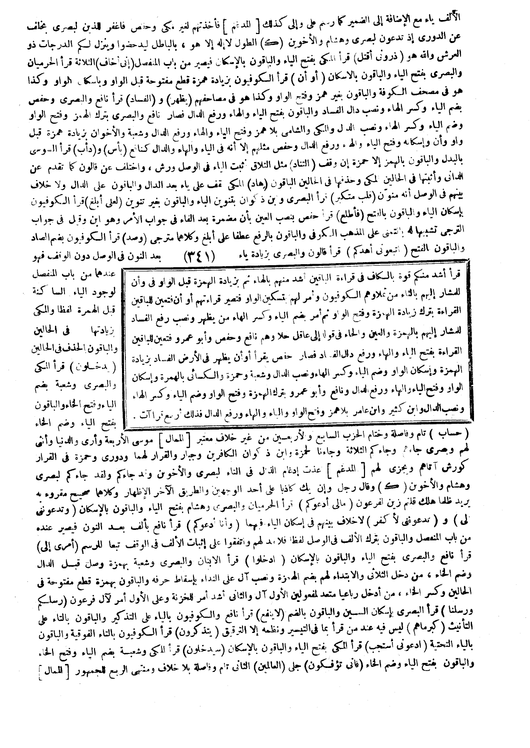 قرأ أَشَدَّ مِنْكُمْ قُوَّةً [غافر: 21] بالكاف في قراءة الباقين أشد منهم بالهاء ثم بزيادة الهمزة قبل الواو في وأن للمشار إليهم بالثاء من ثملا وهم الكوفيون وأمر لهم بتسكين الواو فتصير قراءتهم أو أن فتعين للباقين القراءة بترك زيادة الهمزة وفتح الواو ثم أمر بضم الياء وكسر الهاء من يظهر ونصب رفع الفساد للمشار إليهم بالهمزة والعين والحاء في قوله إلى عاقل حلا وهم نافع وحفص وأبو عمرو فتعين للباقين القراءة بفتح الياء والهاء ورفع دال الفساد فصار حفص يقرأ أو أن يظهر في الأرض الفساد بزيادة الهمزة وإسكان الواو وضم الياء وكسر الهاء ونصب الدال وشعبة وحمزة والكسائي بالهمزة وإسكان الواو وفتح الياء والهاء ورفع الدال ونافع وأبو عمرو بترك الهمزة وفتح الواو