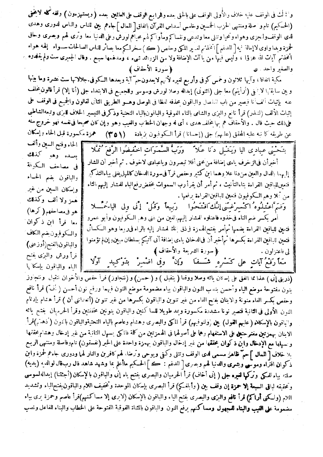 أخبر أن في الزخرف ياءي إضافة من تحتي أَفَلا تُبْصِرُونَ [الزخرف: 51]، و (يا عبادي لا خوف) [الزخرف: 68]. ثم أخبر أن المشار إليهما بالدال والعين من دنا علا وهما ابن كثير وحفص قرآ في سورة الدخان كَالْمُهْلِ يَغْلِي [الدخان: 45]، بياء التذكير فتعين للباقين القراءة بتاء التأنيث، ثم أمر أن يقرأ رَبِّ السَّماواتِ [الدخان: 7] بخفض رفع الباء للمشار إليهم بالثاء من ثملا وهم الكوفيون فتعين للباقين القراءة برفعها.