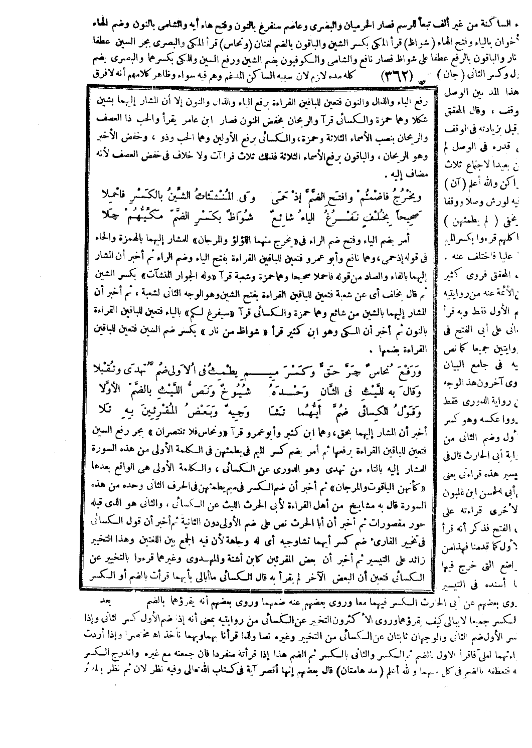 أخبر أن المشار إليهما بحق، وهما ابن كثير وأبو عمرو قرآ وَنُحاسٌ فَلا تَنْتَصِرانِ [الرحمن: 35] بجر رفع السين فتعين للباقين القراءة برفعها ثم أمر بضم كسر الميم في يَطْمِثْهُنَّ [الرحمن: 56] في الكلمة الأولى من هذه السورة للمشار إليه بالتاء من تهدى وهو الدوري عن الكسائي، والكلمة الأولى هي الواقع بعدها كَأَنَّهُنَّ الْياقُوتُ وَالْمَرْجانُ [الرحمن: 58] ثم أخبر أن ضم الكسر في ميم يَطْمِثْهُنَّ [الرحمن: 56] في الحرف الثاني وحده من هذه السورة قال به مشايخ من أهل القراءة لأبي الحرث الليث عن الكسائي، والثاني هو الذي قبله حُورٌ مَقْصُوراتٌ [الرحمن: 72] ثم أخبر أن أبا الحرث نص على ضم الأولى دون الثانية ثم أخبر أن قول الكسائي في تخيير القارئ ضم كسر أيهما تشا وجيه أي له وجاهة لأن فيه الجمع بين اللغتين وهذا التخيير زائد على التيسير ثم أخبر أن بعض المقرئين كابن أشتة والمهدوي وغيرهما قرءوا بالتخيير عن الكسائي فتعين أن البعض الآخر لم يقرأ به قال الكسائي ما أبالي بأيهما قرأت بالضم أو الكسر