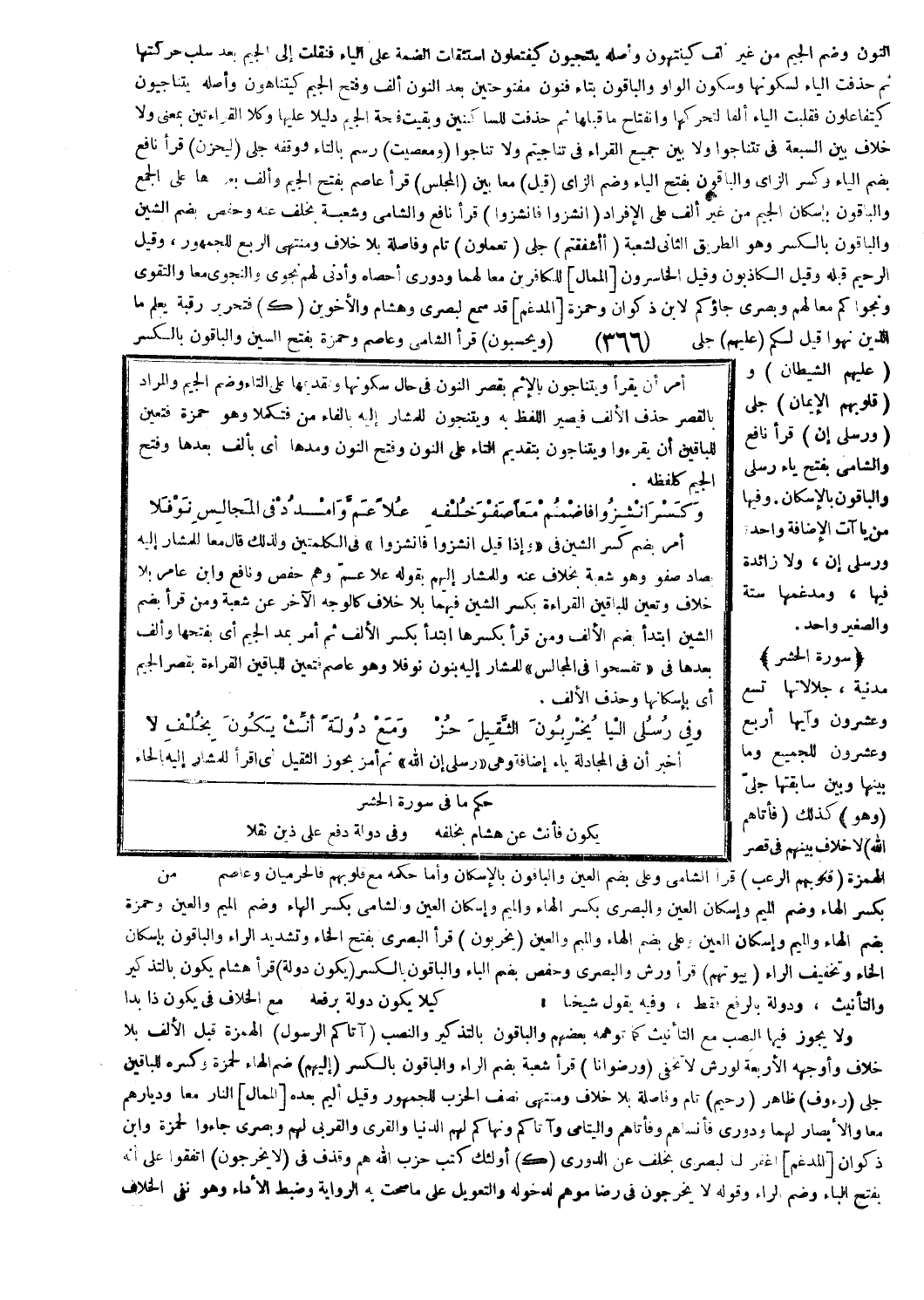 أمر بضم كسر الشين في وَإِذا قِيلَ انْشُزُوا فَانْشُزُوا [المجادلة: 11] في الكلمتين ولذلك قال معا للمشار إليه بصاد صفو وهو شعبة بخلاف عنه وللمشار إليهم بقوله علا عمّ وهما حفص ونافع وابن عامر بلا خلاف، وتعين للباقين القراءة بكسر الشين فيهما بلا خلاف كالوجه الآخر عن شعبة ومن قرأ بضم الشين ابتدأ بضم الألف ومن قرأ بكسرها ابتدأ بكسر الألف ثم أمر بمد الجيم أي بفتحها وألف بعدها في «تفسحوا في المجالس» للمشار إليه