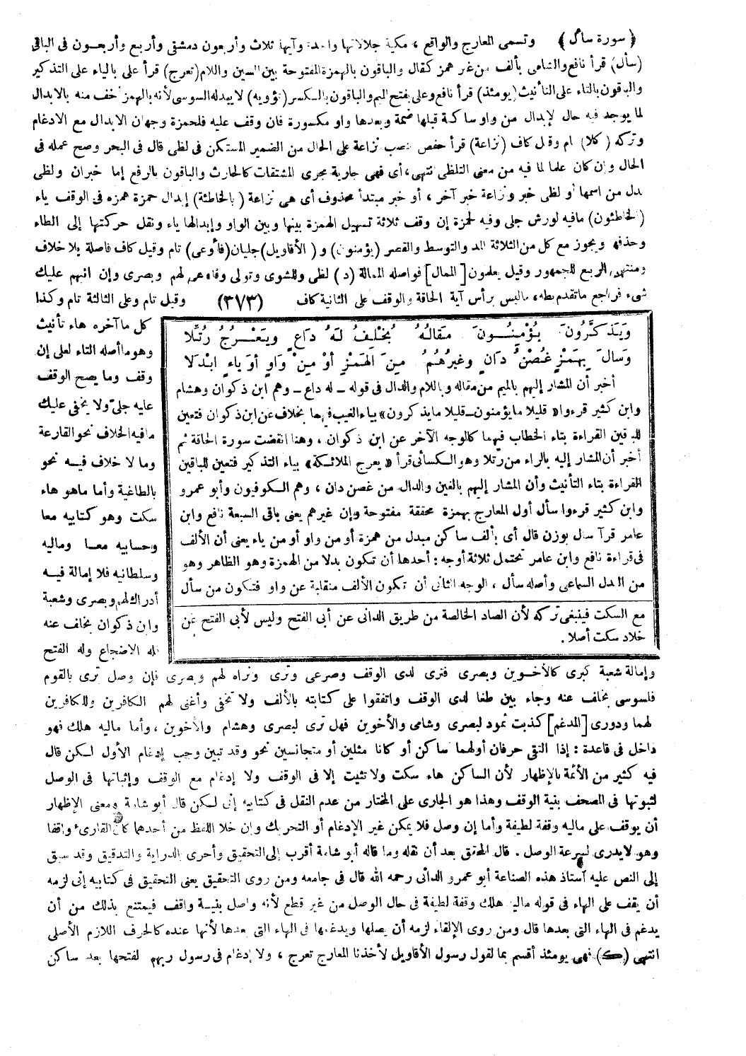 أخبر أن المشار إليهم بالميم من مقاله وباللام والدال في قوله- له داع- وهم ابن ذكوان وهشام وابن كثير قرءوا فَقَلِيلًا ما يُؤْمِنُونَ- قليلا ما يذكرون [الحاقة: 41 و 42]، بياء الغيب فيهما بخلاف عن ابن ذكوان فتعين للباقين القراءة بتاء الخطاب فيهما كالوجه الآخر عن ابن ذكوان، وهنا انقضت سورة الحاقة ثم أخبر أن المشار إليه بالراء من رتلا وهو الكسائي قرأ (يعرج الملائكة) [المعارج: 4] بياء التذكير فتعين للباقين القراءة بتاء التأنيث وأن المشار إليهم بالغين والدال من غصن دان، وهم الكوفيون وأبو عمرو وابن كثير قرءوا سأل أول المعارج بهمزة محققة مفتوحة وإن غيرهم يعني باقي السبعة نافع وابن عامر قرآ سال بوزن قال أي بألف ساكن مبدل من همزة أو من واو أو من ياء يعني أن الألف في قراءة نافع وابن عامر تحتمل ثلاثة أوجه: أحدها أن تكون بدلا من الهمزة وهو الظاهر وهو من البدل السماعي وأصله سأل، الوجه الثاني أن تكون الألف منقلبة عن واو فتكون من سأل