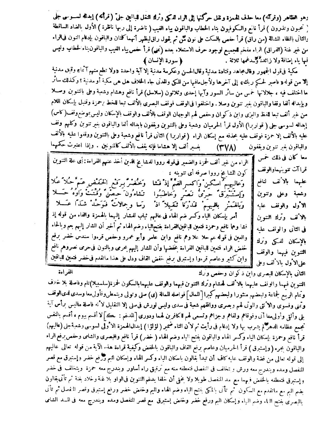أخر بإسكان الياء وكسر ضم الهاء في عاليهم ثياب للمشار إليهما بالهمزة والفاء من قوله إذ فشا وهما نافع وحمزة فتعين للباقين القراءة بفتح الياء وضم الهاء ثم أخبر أن المشار إليهم بعم وبالحاء والعين في قوله عم حلا علا وهم نافع وابن عامر وأبو عمرو وحفص قرءوا سُندُسٍ خُضْرٌ [الإنسان: 21] برفع خفض الراء فتعين للباقين القراءة بخفضها وأن المشار إليهم بحرمي وبالنون في حرمي نصر وهم نافع وابن كثير وعاصم قرءوا وَإِسْتَبْرَقٌ [الإنسان: 21] برفع خفض القاف ودل على هذا ما تقدم في خضر فتعين للباقين