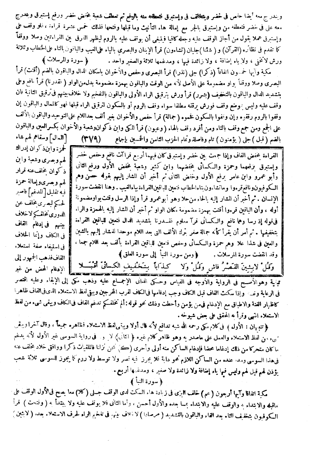 القراءة بخفض القاف وإذا جمعت بين خضر وإستبرق كان فيهما أربع قراءات نافع وحفص خضر وإستبرق برفعهما وحمزة والكسائي بخفضهما وابن كثير وشعبة بخفض الأول ورفع الثاني وأبو عمرو وابن عامر برفع الأول وخفض الثاني ثم أخبر أن المشار إليهم بقوله حصن وهم الكوفيون ونافع قرءوا وَما تَشاؤُنَ [الإنسان: 30] بتاء الخطاب فتعين للباقين القراءة بياء الغيب. وهنا انقضت سورة الإنسان. ثم أخبر أن المشار إليه بالحاء من حلا وهو أبو عمرو قرأ (وإذا الرسل وقتت) [المرسلات: 11] بواو مضمومة أوله، وأن الباقين قرءوا أقتت بهمزة مضمومة مكان الواو ثم أخبر أن المشار إليه بالهمزة والراء في قوله: إذ رسا وهما نافع والكسائي قرآ معلوم فقدرنا بتشديد الدال فتعين للباقين القراءة بتخفيفها. ثم أمر أن يقرأ كأنه (جمالة صفر) [المرسلات: 33] بترك الألف التي بعد اللام موحدا للمشار إليهم بالشين والعين في شذا علا وهم حمزة والكسائي وحفص فتعين للباقين القراءة بألف بعد اللام جمعا، وقد انقضت سورة المرسلات.