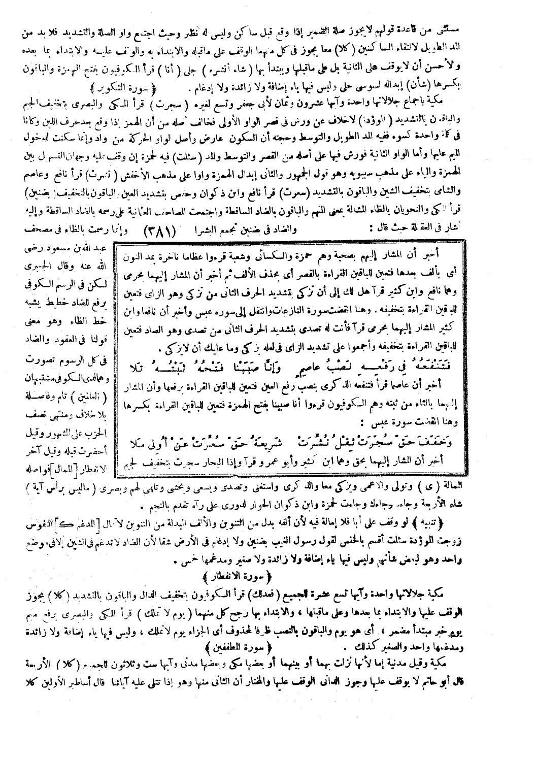 أخبر أن المشار إليهم بصحبة وهم حمزة والكسائي وشعبة قرءوا (عظاما ناخرة) [النازعات: 11] بمد النون أي بألف بعدها فتعين للباقين القراءة بالقصر أي بحذف الألف ثم أخبر أن المشار إليهما بحرمي وهما نافع وابن كثير قرآ هل لك إلى أن تزكى بتشديد الحرف الثاني من تزكى وهو الزاي فتعين للباقين القراءة بتخفيفه. وهنا انقضت سورة النازعات وانتقل إلى سورة عبس وأخبر أن نافعا وابن كثير المشار إليهما بحرمي قرآ فَأَنْتَ لَهُ تَصَدَّى [عبس: 6] بتشديد الحرف الثاني من تصدى وهو الصاد فتعين للباقين القراءة بتخفيفه وأجمعوا على تشديد الزاي في لَعَلَّهُ يَزَّكَّى [عبس: 3] (وما عليك أن لا يزكى) [عبس: 7].