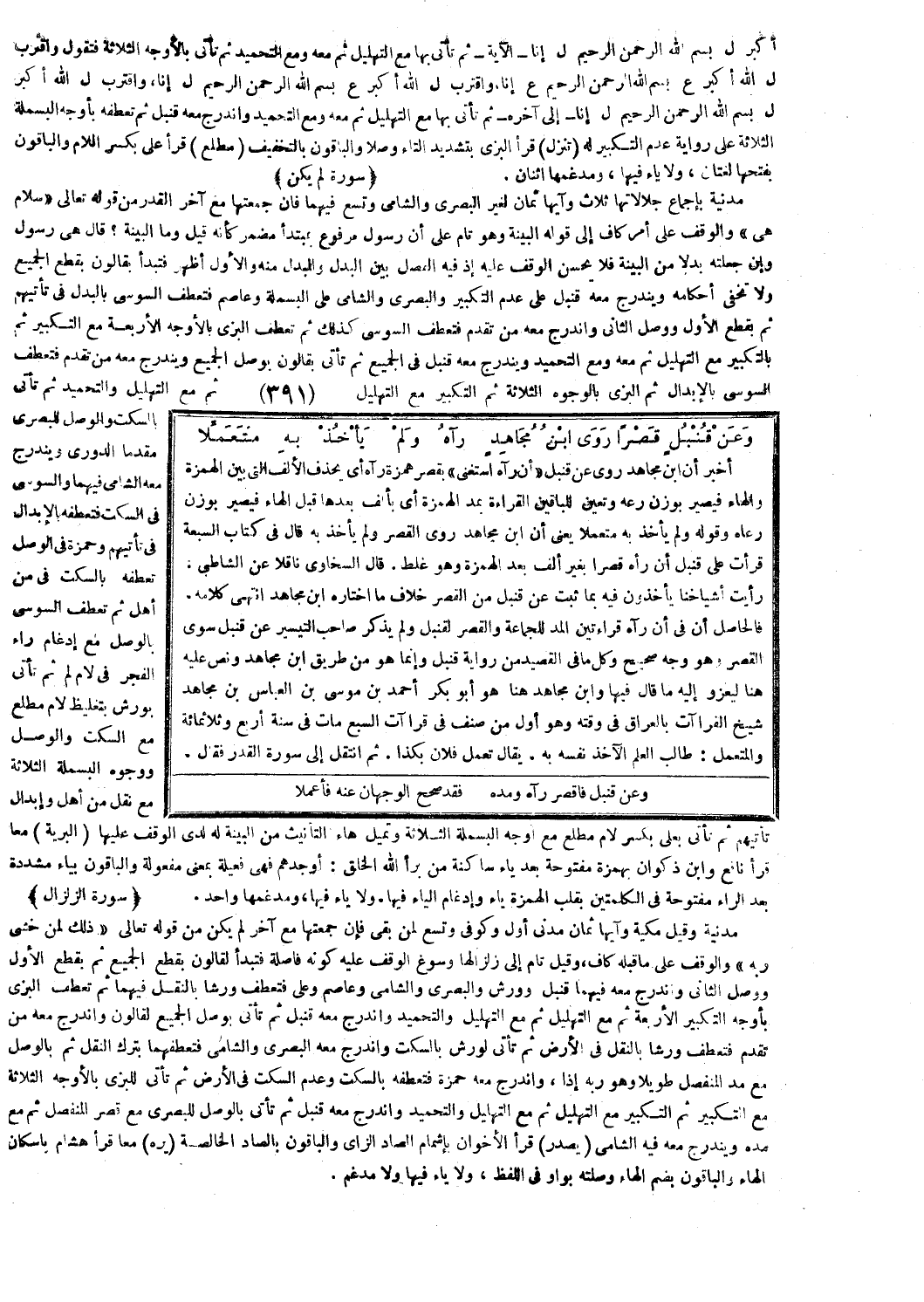 أخبر أن ابن مجاهد روى عن قنبل أَنْ رَآهُ اسْتَغْنى [العلق: 7] بقصر همزة رآه أي بحذف الألف التي بين الهمزة والهاء فيصير بوزن رعه وتعين للباقين القراءة بمد الهمزة أي بألف بعدها قبل الهاء فيصير بوزن رعاه وقوله: ولم يأخذ به متعملا يعني أن ابن مجاهد روى القصر ولم يأخذ به قال في كتاب السبعة قرأت على قنبل أن رأه قصرا بغير ألف بعد الهمزة وهو غلط. قال السخاوي ناقلا عن الشاطبي: رأيت أشياخنا يأخذون فيه بما ثبت عن قنبل من القصر خلاف ما اختاره ابن مجاهد انتهى كلامه، فالحاصل أن في أن رآه قراءتين المد للجماعة والقصر لقنبل ولم يذكر صاحب التيسير عن قنبل سوى القصر وهو وجه صحيح وكل ما في القصيد من رواية قنبل وإنما هو من طريق ابن مجاهد ونص عليه هنا ليعزو إليه ما قال فيها وابن مجاهد هنا هو أبو بكر أحمد بن موسى بن العباس بن مجاهد شيخ القراءات بالعراق في وقته وهو أول من صنف في قراءات السبع مات في سنة أربع وثلاثمائة والمتعمل: طالب العلم الآخذ نفسه به. يقال تعمل فلان بكذا. ثم انتقل إلى سورة القدر فقال:
