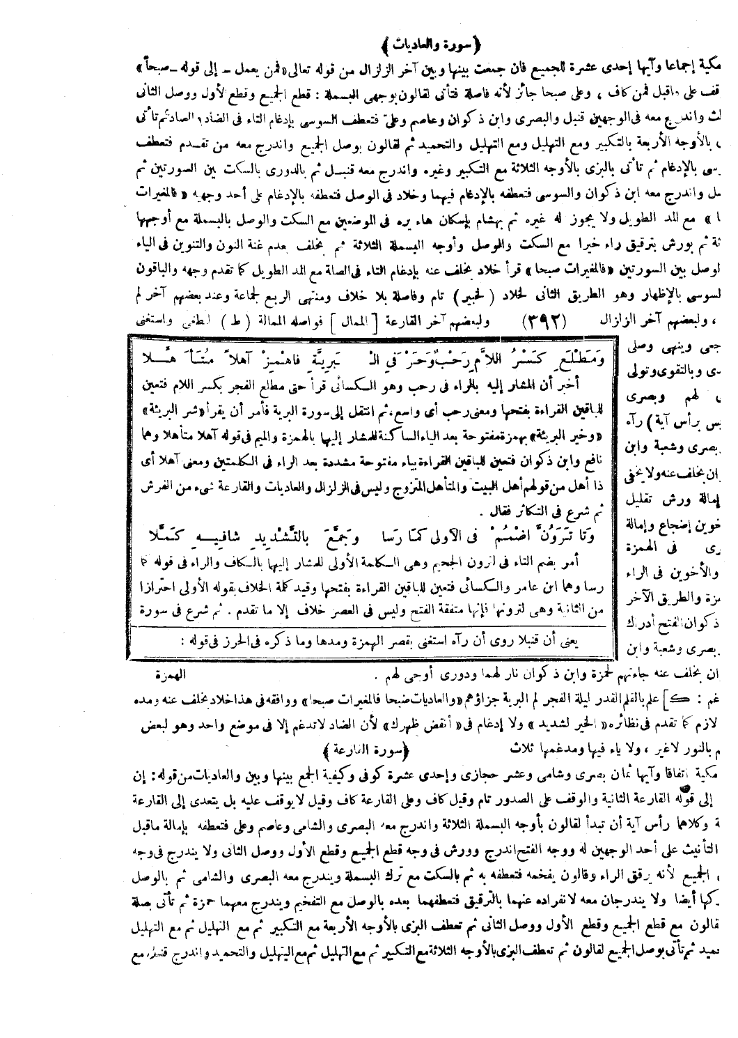 أخبر أن المشار إليه بالراء في رحب وهو الكسائي قرأ حتى مطلع الفجر بكسر اللام فتعين للباقين القراءة بفتحها ومعنى رحب أي واسع. ثم انتقل إلى سورة البرية فأمر أن يقرأ «شر البريئة» و «خير البريئة» بهمزة مفتوحة بعد الياء الساكنة للمشار إليهما بالهمزة والميم في قوله آهلا متأهلا وهما نافع وابن ذكوان فتعين للباقين القراءة بياء مفتوحة مشددة بعد الراء في الكلمتين ومعنى آهلا أي ذا أهل من قولهم أهل البيت والمتأهل المتزوج وليس في الزلزال والعاديات والقارعة شيء من الفرش ثم شرع في التكاثر فقال: