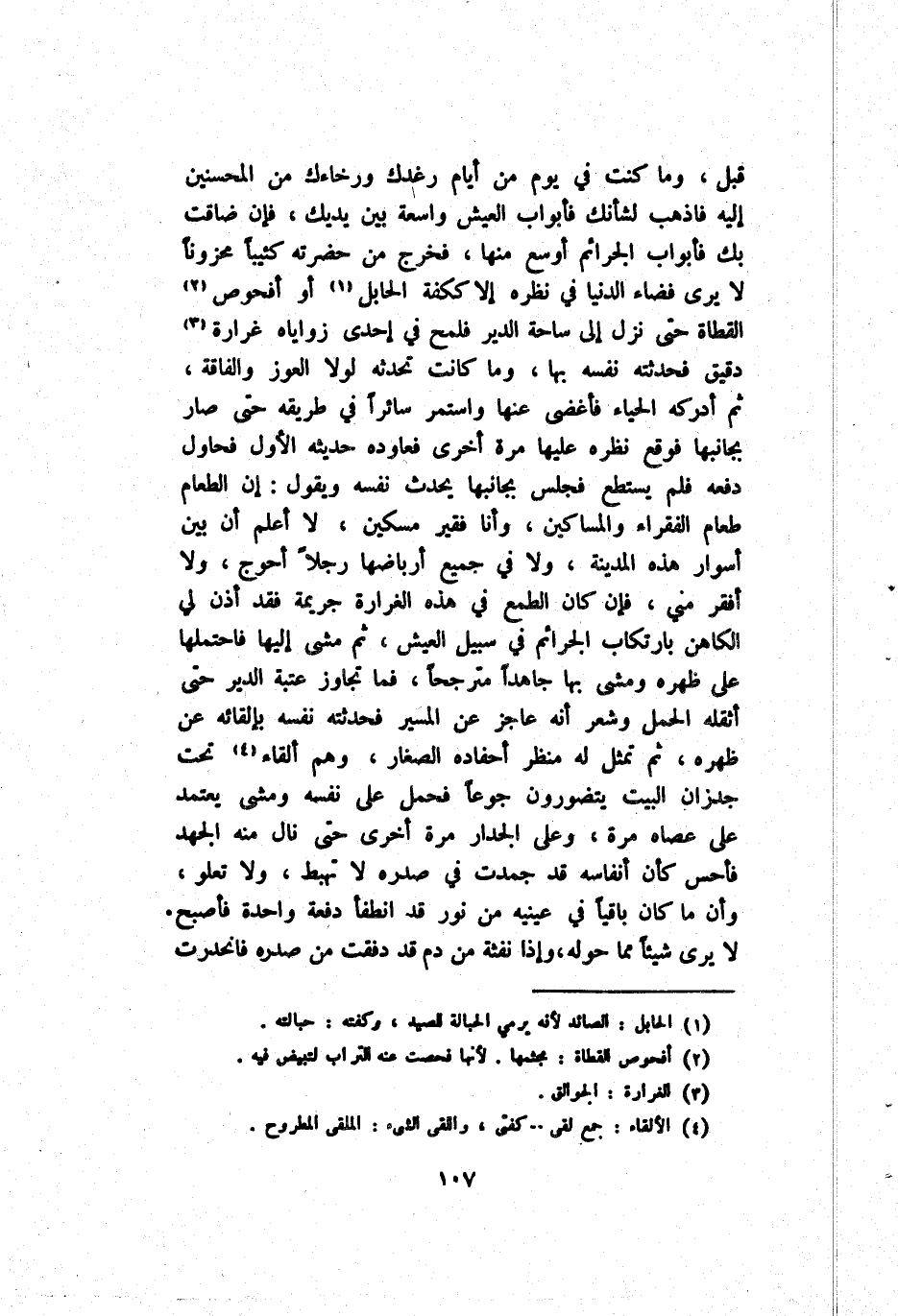 قَبْل وَمَا كُنْت فِي يَوْم مِنْ أَيَّام رَغَدك وَرَخَاءَك مِنْ اَلْمُحْسِنِينَ إِلَيْهِ فَاذْهَبْ لِشَأْنِك فَأَبْوَاب اَلْعَيْش وَاسِعَة بَيْن يَدَيْك فَإِنْ ضَاقَتْ بِك فَأَبْوَاب اَلْجَرَائِم أَوْسَع مِنْهَا فَخَرَجَ مِنْ حَضَرْته كَئِيبًا مَحْزُونًا لَا يَرَى فَضَاء اَلدُّنْيَا فِي نَظَره إِلَّا كَكِفَّة اَلْحَابِل أَوْ أفحوص اَلْقَطَاة حَتَّى نَزَلَ إِلَى سَاحَة اَلدَّيْر فَلَمَحَ فِي إِحْدَى زَوَايَاهُ غرارة دَقِيق فَحَدَّثَتْهُ نَفْسه بِهَا وَمَا كَانَتْ تُحَدِّثهُ لَوْلَا اَلْعَوَز وَالْفَاقَة ثُمَّ أَدْرَكَهُ اَلْحَيَاء فأغضى عَنْهَا وَاسْتَمَرَّ سَائِرًا فِي طَرِيقه حَتَّى صَارَ بِجَانِبِهَا فَوَقِّعْ نَظَره عَلَيْهَا مَرَّة أُخْرَى فَعَاوَدَهُ حَدِيثه اَلْأَوَّل فَحَاوَلَ دَفْعه فَلَمْ يَسْتَطِعْ فَجَلَسَ بِجَانِبِهَا يَحْدُث نَفْسه وَيَقُول إِنَّ اَلطَّعَام طَعَام اَلْفُقَرَاء وَالْمَسَاكِين وَأَنَا فَقِير مِسْكِين لَا أَعْلَم أَنَّ بَيْن أَسْوَار هَذِهِ اَلْمَدَنِيَّة وَلَا فِي جَمِيع أرباضها رَجُلًا أَحْوَج وَلَا أَفْقَر مِنِّي فَإِنْ كَانَ اَلطَّمَع فِي هَذِهِ الغرارة جَرِيمَة فَقَدْ أَذِنَ لِي اَلْكَاهِن بِارْتِكَاب اَلْجَرَائِم فِي سَبِيل اَلْعَيْش ثُمَّ مَشَى إِلَيْهَا فَاحْتَمَلَهَا عَلَى ظَهْره وَمَشَى بِهَا جَاهِدًا مترجحا فَمَا تج - اوز عَتَبَة اَلدَّيْر حَتَّى أَثْقَلَهُ اَلْحَمْل وَشَعَرَ أَنَّهُ عَاجِز عَنْ اَلسَّمِير فَحَدَّثَتْهُ نَفْسه بِإِلْقَائِهِ عَنْ ظَهْره ثُمَّ تمقل لَهُ مَنْظَر أَحْفَاده اَلصِّغَار وَهُمْ ألقاء تَحْت جُدْرَان اَلْبَيْت يَتَضَوَّرُونَ جُوعًا فَحِمْل عَلَى نَفْسه وَمَشَى يَعْتَمِد عَلَى عَصَاهُ مَرَّة وَعَلَى اَلْجِدَار مَرَّة وَعَلَى اَلْجِدَار كُرَة أُخْرَى حَتَّى نَالَ مِنْهُ اَلْجُهْد فَأَحَسَّ كَأَنَّ أَنْفَاسه قَدْ جَمَّدَتْ فِي صَدْره لَا تَهْبِط وَلَا تَعْلُو وَأَنَّ مَا كَانَ بَاقِيًا فِي عَيْنَيْهِ مِنْ نُور قَدْ أنطفأ دُفْعَة وَاحِدَة فَأَصْبَحَ لَا يَرَى شَيْئًا مِمَّا حَوْله وَإِذَا نفثة مِنْ دَم دفقت مِنْ صدرة فَانْحَدَرَتْ