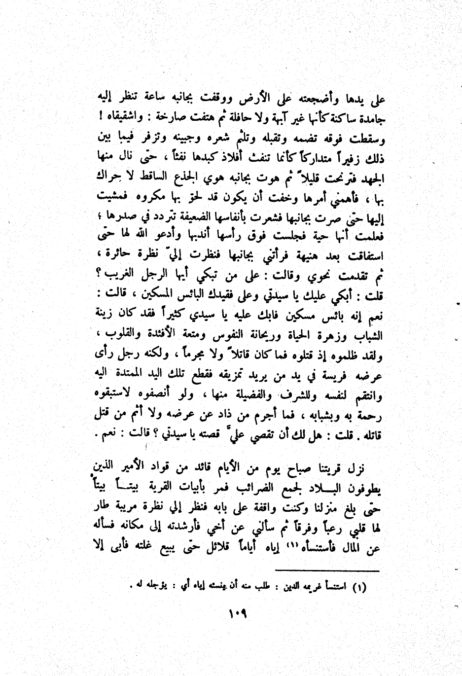 نَزَلَ قَرْيَتنَا صَبَاح يَوْم مِنْ اَلْأَيَّام قَائِد مِنْ قُوَّاد اَلْأَمِير اَلَّذِينَ يَطُوفُونَ اَلْبِلَاد لِجَمْع اَلضَّرَائِب فَمَرَّ بِأَبْيَات اَلْقَرْيَة بَيْتًا بَيْتًا حَتَّى بَلَغَ مَنْزِلنَا وَكُنْت وَاقِفَة عَلَى بَابه فَنَظَر إِلَيَّ نَظْرَة مُرِيبَة طَارَ لَهَا قَلْبِي رَعَبَا وَفَرَّقَا ثُمَّ سَأَلَنِي عَنْ أَخِي فَأَرْشَدَتْهُ إِلَى مَكَانه فَسَأَلَهُ عَنْ اَلْمَال فأستنسأه إِيَّاهُ قَلَائِل حَتَّى يَبِيع غَلَّته فَأَبَى إِلَّا