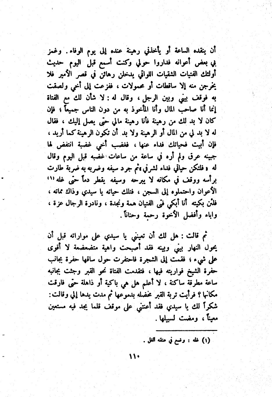 أَنْ يَنْقُدهُ اَلسَّاعَة أَوْ يَأْخُذنِي رَهِينَة عِنْده إِلَى يَوْم اَلْوَفَاء وَغَمْز بِي بَعْض أَعْوَانه فَدَارُوا حَوْلِي وَكُنْت أَسْمَع قَبْل اَلْيَوْم حَدِيث أُولَئِكَ اَلْفَتَيَات اَلشَّقِيَّات اَللَّوَاتِي يُدْخِلْنَ رَهَائِن فِي قَصْر اَلْأَمِير فَلَا يَخْرُجْنَ مِنْهُ إِلَّا سَاقِطَات أَوْ مَحْمُولَات فَفَزِعَتْ إِلَى أَخِي وَلَصِقَتْ بِهِ فَوَقَفَ بَيْنِي اَلرَّجُل وَقَالَ لَهُ لَا شَأْن لَك مَعَ اَلْفَتَاة إِنَّمَا أَنَا صَاحِب اَلْمَال وَأَنَا اَلْمَأْخُوذ بِهِ مِنْ دُون اَلنَّاس جَمِيعًا فَإِنْ كَانَ لَا بُدّ لَك مِنْ رَهِينَة فَأَنَا رَهِينَة مَالِي حَتَّى يَصِل إِلَيْك فَقَالَ لَهُ لَابُدَّ مِنْ اَلْمَال أَوْ اَلرَّهِينَة وَلَا بُدّ أَنْ تَكُون اَلرَّهِينَة كَمَا أُرِيد فَإِنْ أَبَيْت فَحَيَاتك فِدَاء عَنْهَا فَغَضِبَ أَخِي غضبة اِنْتَفَضَ لَهَا جَبِينه عَرَق وَلَمْ أَرَهُ فِي سَاعَة مِنْ سَاعَات غَضَبه قَبْل اَلْيَوْم وَقَالَ لَهُ فَلْتَكُنْ حَيَاتِي فَدَاء لِشَرَفِي ثُمَّ جَرَّدَ سَيْفه وَضَرْبه بِهِ ضَرْبَة طَارَتْ بِرَأْسِهِ وَوَقَفَ فِي مَكَانه لَا يَبْرَحهُ وَسَيْفه يَقْطُر دَمًا حَتَّى غِلّه اَلْأَعْوَان وَاحْتَمَلُوهُ إِلَى اَلسِّجْن فَتِلْكَ حَيَاته يَا سَيِّدِي وَذَاكَ مَمَاته فَلَئِنْ بَكَيْته أَنَا أَبْكِي فَتِيّ اَلْفِتْيَان هِمَّة وَنَجْدَة وَنَادِرَة اَلرِّجَال عِزَّة واباء وَأَفْضَل اَلْأُخُوَّة رَحْمَة وَحَنَانًا.