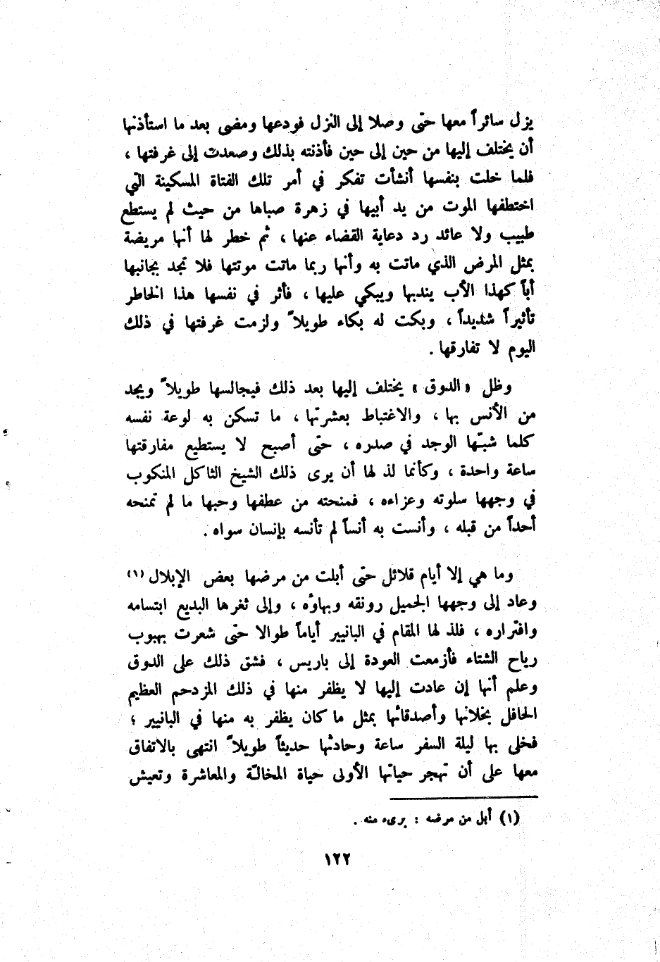 وَمَا هِيَ أَيَّام قَلَائِل حَتَّى أَبْلَتْ مِنْ مَرَضهَا بَعْض الإبلال وَعَاد إِلَى وَجْههَا رَوْنَقه وَبَهَاؤُهُ وَإِلَى ثَغْرهَا اَلْبَدِيع اِبْتِسَامه وافتراره فَلَذَّ لَهَا اَلْمَقَام فِي البانيير أَيَّامًا طِوَالًا حَتَّى شَعَرَتْ بِهُبُوب رِيَاح اَلشِّتَاء فَأَزْمَعَتْ اَلْعَوْدَة إِلَى بَارِيس فَشَقَّ ذَلِكَ عَلَى اَلدُّوق وَعَلَم أَنَّهَا إِنْ عَادَتْ إِلَيْهَا لَا يَظْفَر مِنْهَا فِي ذَلِكَ اَلْمُزْدَحِم اَلْعَظِيم اَلْحَافِل بِخُلَّانِهَا وَأَصْدِقَائِهَا بِمِثْل مَا كَانَ يَظْفَر بِهِ مِنْهَا فِي البانيير فَخَلَّى بِهَا لَيْلَة اَلسَّفَر سَاعَة وَحَادَثَهَا حَدِيثًا طَوِيلًا وَانْتَهِي بِالِاتِّفَاقِ مَعَهَا عَلَى أَنْ تَهْجُر حَيَاتهَا اَلْأَوْلَى حَيَاة المخالة وَالْمُعَاشَرَة وَتَعِيش