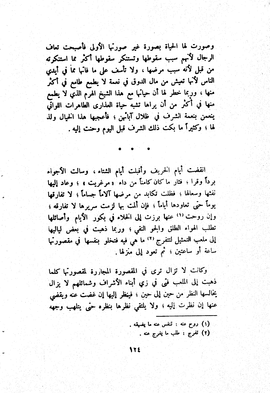 وَكَانَتْ لَا يَزَال تَرَى فِي اَلْمَقْصُورَة اَلْمُجَاوِرَة لِمَقْصُورَتِهَا كُلَّمَا ذَهَبَتْ إِلَى اَلْمَلْعَب فَتَى فِي زِيّ أَبْنَاء اَلْأَشْرَاف وَشَمَائِلهمْ لَا يَزَال يخالسها النطر مِنْ حِين إِلَى حِين فَيَنْظُر إِلَيْهَا إِنْ غَضَّتْ عَنْهُ وَيَقْضِي عَنْهَا إِنْ نَظَرَتْ إِلَيْهِ وَلَا يَلْتَقِي نَظَرهَا بِنَظَرِهِ حَتَّى يتلهب وَجْهه