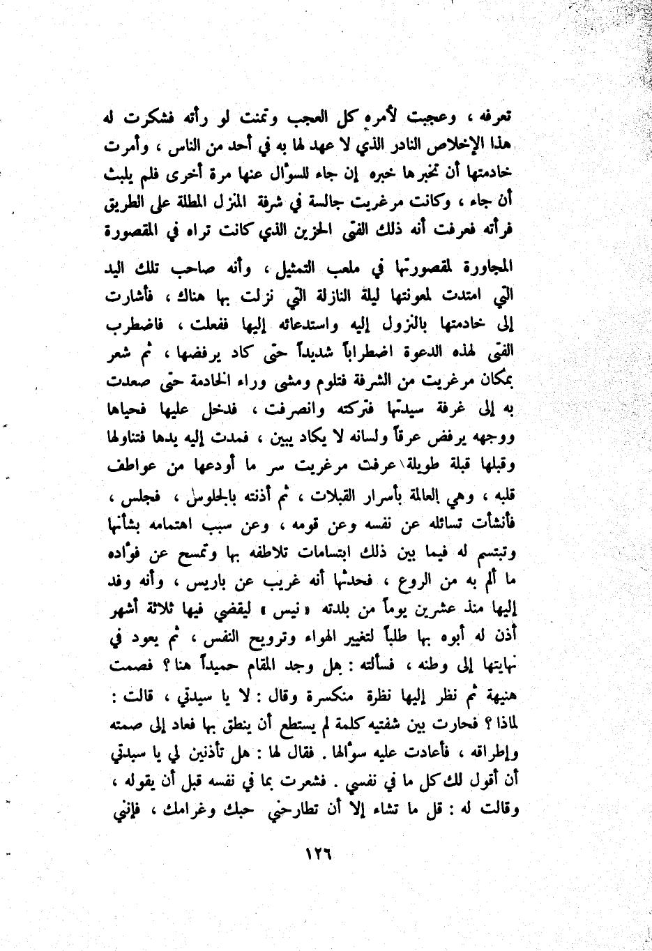 تَعْرِفهُ وَعَجِبَتْ لِأَمْرِهِ كُلّ اَلْعَجَب وَتَمَنَّتْ لَوْ رَأَتْهُ فَشَكَرَتْ لَهُ هَذَا اَلْإِخْلَاص اَلنَّادِر اَلَّذِي لَا عَهْد لَهَا بِهِ فِي أَحَد مِنْ اَلنَّاس وَأَمَرَتْ خَادِمَتهَا أَنْ تُخْبِرهَا خَبَره إِنْ جَاءَ لِلسُّؤَالِ عَنْهَا مَرَّة أُخْرَى فَلَمْ يَلْبَث أَنْ جَاءَ وَكَانَتْ مَرْغِرِيت جَالِسَة فِي شُرْفَة اَلْمَنْزِل اَلْمُطِلَّة عَلَى اَلطَّرِيق فَرَأَتْهُ فَعَرَفَتْ أَنَّهُ ذَلِكَ اَلْفَتَى اَلْحَزِين اَلَّذِي كَانَتْ تَرَاهُ فِي اَلْمَقْصُورَة اَلْمُجَاوِرَة لِمَقْصُورَتِهَا فِي مَلْعَب اَلتَّمْثِيل وَأَنَّهُ صَاحِب تِلْكَ اَلْيَد اَلَّتِي اِمْتَدَّتْ لِمَعُونَتِهَا لَيْلَة اَلنَّازِلَة اَلَّتِي نَزَلَتْ بِهَا هُنَاكَ فَأَشَارَتْ إِلَى خَادِمَتهَا بِالنُّزُولِ إِلَيْهِ وَاسْتِدْعَائِهِ إِلَيْهَا فَفَعَلَتْ فَاضْطَرَبَ اَلْفَتِيّ لِهَذِهِ اَلدَّعْوَة اِضْطِرَابًا شَدِيدًا حَتَّى كَادَ يَرْفُضهَا ثُمَّ شَعَرَ بِمَكَان مَرْغِرِيت مِنْ اَلشُّرْفَة فَتَلُوم وَمَشْي وَرَاء اَلْخَادِمَة حَتَّى صَعِدَتْ بِهِ إِلَى غُرْفَة سَيِّدَتهَا فَتَرَكْته وَانْصَرَفْت فَدَخَلَ عَلَيْهَا فَحَيَّاهَا وَوَجْهه يَرْفُض عِرْقًا وَلِسَانه لَا يَكَاد يُبَيِّن فَمَدَّتْ إِلَيْهِ يَدهَا فَتَنَاوَلَهَا وَقَبِلَهَا قُبْلَة طَوِيلَة عَرَفَتْ مَرْغِرِيت سِرّ مَا أُودِعهَا مِنْ عَوَاطِف قَلْبه وَهِيَ اَلْعَالِمَة بِأَسْرَار اَلْقُبُلَات ثُمَّ آذَنَتْهُ بِالْجُلُوسِ فَجَلَسَ فَأَنْشَأَتْ تُسَائِلهُ عَنْ نَفْسه وَعَنْ قَوْمه وَعَنْ سَبَب اِهْتِمَامه بِشَأْنِهَا وَتَبْتَسِم لَهُ فِيمَا بَيْن ذَلِكَ اِبْتِسَامَات تُلَاطِفهُ بِهَا وَتَمْسَح عَنْ فُؤَاده مَا أُلِمّ بِهِ مِنْ اَلرَّوْع فَحَدَّثَهَا أَنَّهُ غَرِيب عَنْ بَارِيس وَأَنَّهُ وَفَدَ إِلَيْهَا مُنْذُ عِشْرِينَ يَوْمًا مِنْ بَلْدَته نيس لِيَقْضِيَ فِيهَا ثَلَاثَة أَشْهُر أُذُن لَهُ أَبُوهُ بِهَا طَلَبًا لِتَغْيِير اَلْهَوَاء وَتَرْوِيح اَلنَّفْس ثُمَّ يَعُود فِي نِهَايَتهَا إِلَى وَطَنه فَسَأَلَتْهُ هَلْ وَجَدَ اَلْمَقَام حَمِيدًا هُنَا فَصَمَتَ هُنَيْهَة ثُمَّ نَظَرَ إِلَيْهَا نَظْرَة مُنْكَسِرَة وَقَالَ لَا يَا سَيِّدَتِي قَالَتْ لِمَاذَا فَحَارَتْ بَيْن شَفَتَيْهِ كَلِمَة لَمْ يَسْتَطِعْ أَنْ يَنْطِق بِهَا فَعَادَ إِلَى صَمْته وَإِطْرَاقه فَأَعَادَتْ عَلَيْهِ سُؤَالهَا فَقَالَ لَهَا هَلْ تَأْذَنِينَ لِي يَا سَيِّدَتِي أَنْ أَقُول لَك كُلّ مَا فِي نَفْسِي فَشَعَرَتْ بِمَا فِي نَفْسه قَبْل أَنْ يَقُولهُ وَقَالَتْ لَهُ قُلْ مَا تَشَاء إِلَّا أَنْ تُطَارِحنِي حُبّك وَغَرَامك فَإِنَّنِي