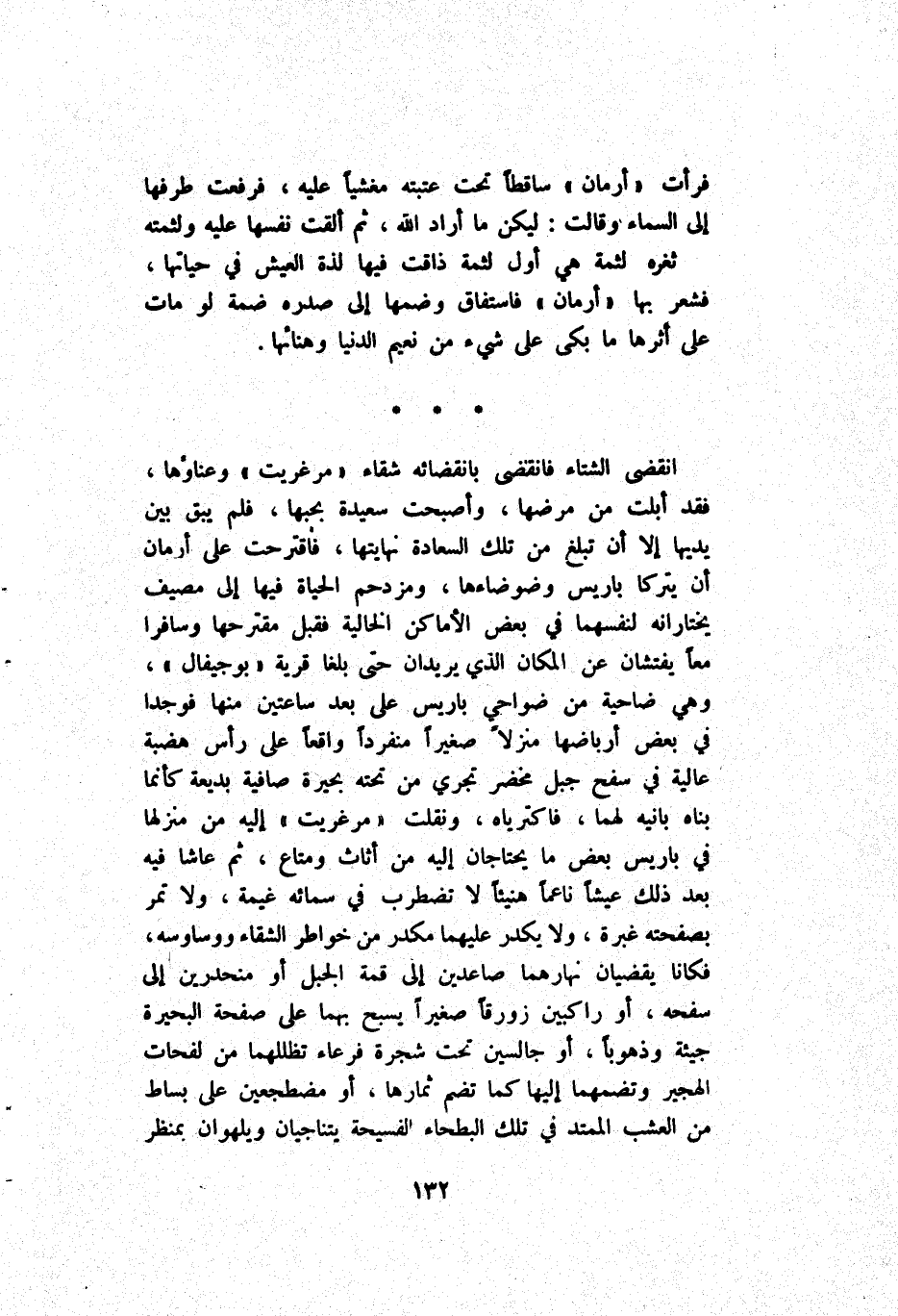 اِنْقَضَى اَلشِّتَاء فَانْقَضَى بِانْقِضَائِهِ شَقَاء مَرْغِرِيت وَعَنَاؤُهَا فَقَدْ أَبْلَتْ مِنْ مَرَضهَا وَأَصْبَحَتْ سَعِيدَة بِحُبِّهَا فَلَمْ يَبْقَ بَيْن يَدَيْهَا إِلَّا أَنْ تَبْلُغ مِنْ تِلْكَ اَلسَّعَادَة نِهَايَتهَا فَاقْتَرَحَتْ عَلَى أَرْمَان أَنْ يَتْرُكَا بَارِيس وَضَوْضَاءَهَا وَمُزْدَحِم اَلْحَيَاة فِيهَا إِلَى مَصِيف يَخْتَارَانِهِ لِنَفْسِهِمَا فِي بَعْض اَلْأَمَاكِن اَلْخَالِيَة فَقَبْل مُقْتَرَحهَا وَسَافَرَا مَعًا يُفَتِّشَانِ عَنْ اَلْمَكَان اَلَّذِي يُرِيدَانِ حَتَّى بَلَغَا قَرْيَة وَهِيَ ضَاحِيَة مِنْ ضَوَاحِي بَارِيس عَلَى بُعْد سَاعَتَيْنِ مِنْهَا فَوَجَدَا فِي بَعْض أرباضها مَنْزِلًا صَغِيرًا مُنْفَرِدًا وَاقِعًا عَلَى رَأْس هَضْبَة عَالِيَة فِي سَفْح جَبَل مُخْضَرّ تَجْرِي مِنْ تَحْته بُحَيْرَة صَافِيَة بَدِيعَة كَأَنَّمَا بِنَاهٍ بَانِيه لَهُمَا فَاشْتَرَيَاهُ وَنَقَلَتْ مَرْغِرِيت إِلَيْهِ مِنْ مَنْزِلهَا فِي بَارِيس بَعْض مَا يَحْتَاجَانِ إِلَيْهِ مِنْ أَثَاث وَمَتَاع ثُمَّ عَاشَا فِيهِ بَعْد ذَلِكَ عَيْشًا نَاعِمًا هَنِيئًا لَا تَضْطَرِب فِي سَمَائِهِ غَيْمَة وَلَا تَمْر بِصَفْحَتِهِ غَبَرَة وَلَا يُكَدِّر عَلَيْهِمَا مُكَدَّر مِنْ خَوَاطِر اَلشَّقَاء وَوَسَاوِسه فَكَانَا يَقْضِيَانِ نَهَارهمَا صَاعِدِينَ إِلَى قِمَّة اَلْجَبَل أَوْ مُنْحَدَرَيْنِ إِلَى سَفْحه أَوْ رَاكِبِينَ زَوْرَقًا صَغِيرًا يَسْبَح بِهِمَا عَلَى صَفْحَة اَلْبُحَيْرَة جِيئَة وذهوبا أَوْ جَالِسِينَ تَحْت شَجَرَة فرعاء تُظَلِّلهَا مِنْ لَفَحَات الهجير وَتَضُمّهُمَا إِلَيْهَا كَمَا تَضُمّ ثِمَارهَا أَوْ مُضْطَجَعَيْنِ عَلَى بِسَاط مِنْ اَلْعُشْب اَلْمُمْتَدّ فِي تَلُمّك اَلْبَطْحَاء اَلْفَسِيحَة يَتَنَاجَيَانِ وَيَلْهُوَانِ بِمَنْظَر