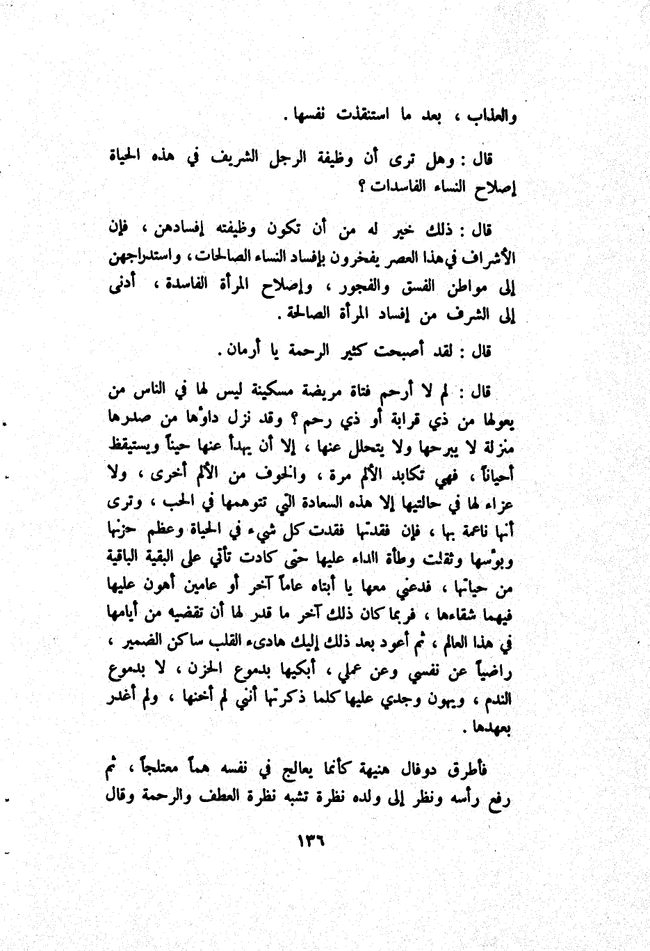 قَالَ وَهَلْ تَرَى أَنَّ وَظِيفَة اَلرَّجُل اَلشَّرِيف فِي هَذِهِ اَلْحَيَاة إِصْلَاح اَلنِّسَاء اَلْفَاسِدَات