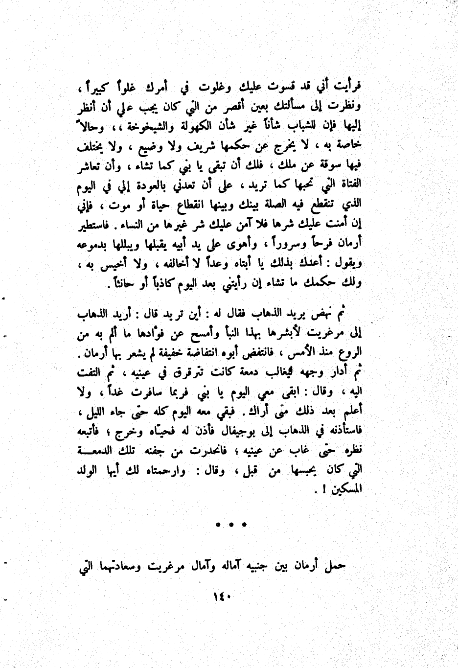 ثُمَّ نَهَضَ يُرِيد اَلذَّهَاب فَقَالَ لَهُ أَيْنَ تُرِيد قَالَ أُرِيد اَلذَّهَاب إِلَى مَرْغِرِيت لِأُبَشِّرهَا بِهَذَا اَلنَّبَأ وَأَمْسَح عَنْ فُؤَادهَا مَا أُلِمّ بِهِ مِنْ اَلرَّوْع مُنْذُ اَلْأَمْس فَانْتَفَضَ أَبُوهُ اِنْتِفَاضَة خَفِيفَة لَمْ يَشْعُر بِهَا أَرْمَان ثُمَّ ادار وَجْهه لِيُغَالِب دَمْعَة كَانَتْ تَتَرَقْرَق فِي عَيْنَيْهِ ثُمَّ اِلْتَفَتَ إِلَيْهِ وَقَالَ ابقي مَعِي اَلْيَوْم يَا بَنِي فَرُبَّمَا سَافَرَتْ غَدَقًا وَلَا أَعْلَم بَعْد ذَلِكَ مَتَى أَرَاك فَبَقِيَ مَعَهُ اَلْيَوْم كُلّه حَتَّى جَاءَ اَللَّيْل فَاسْتَأْذَنَهُ فِي اَلذَّهَاب عَنْ عَيْنَيْهِ فَانْحَدَرَتْ مِنْ جَفْنه تِلْكَ اَلدَّمْعَة نَظَره حَتَّى غَابَ عَنْ عَيْنَيْهِ فَانْحَدَرَتْ مِنْ جَفْنه تِلْكَ اَلدَّمْعَة اَلَّتِي كَانَ يَحْبِسهَا مِنْ قَبْل وَقَالَ وارحمتاه لَك أَيُّهَا اَلْوَالِد اَلْمِسْكِين! حَمَلَ أَرْمَان بَيْن جَنْبَيْهِ آمَاله وَآمَال مَرْغِرِيت وَسَعَادَتهمَا اَلَّتِي