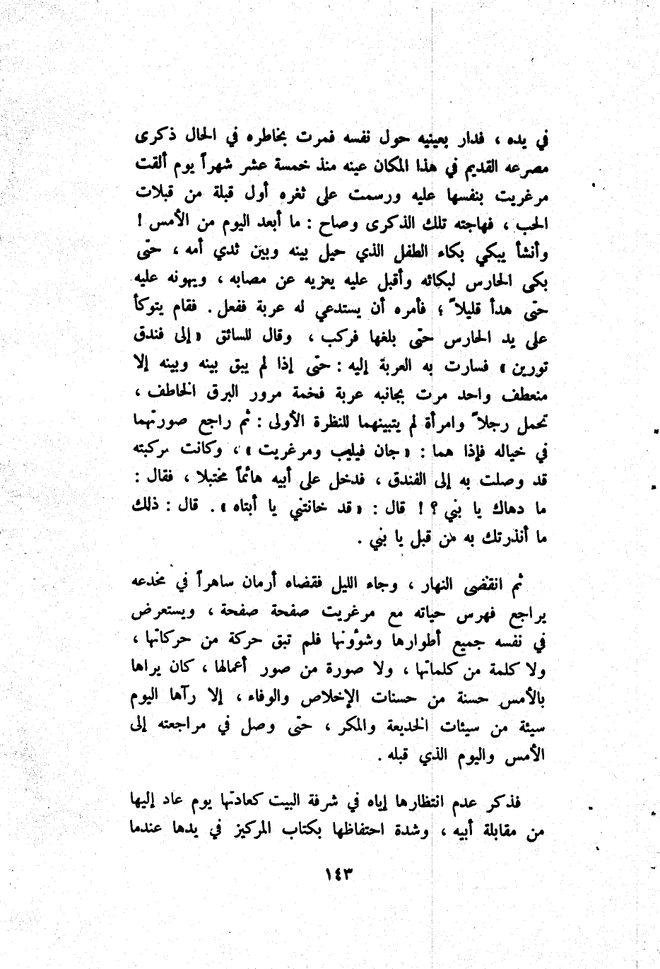 ثُمَّ اِنْقَضَى اَلنَّهَار وَجَاءَ اَللَّيْل فَقَضَاهُ أَرْمَان سَاهِرًا فِي مَخْدَعه يُرَاجِع فِهْرِس حَيَاته مَعَ مَرْغِرِيت صَفْحَة صَفْحَة وَيَسْتَعْرِض فِي نَفْسه جَمِيع أَطْوَارهَا وَشُؤُونهَا فَلَمْ تَبْقَ حَرَكَة مِنْ حَرَكَاتهَا وَلَا كَلِمَة مِنْ كَلِمَاتهَا وَلَا صُورَة مِنْ صُوَر أَعْمَالهَا كَانَ يَرَاهَا بِالْأَمْسِ حَسَنَة مِنْ حَسَنَات اَلْإِخْلَاص وَالْوَفَاء إِلَّا رَآهَا اَلْيَوْم سَيِّئَة مِنْ سَيِّئَات اَلْخَدِيعَة وَالْمَكْر حَتَّى وَصْل فِي مُرَاجَعَته إِلَى اَلْأَمْس وَالْيَوْم اَلَّذِي قَبِلَهُ.