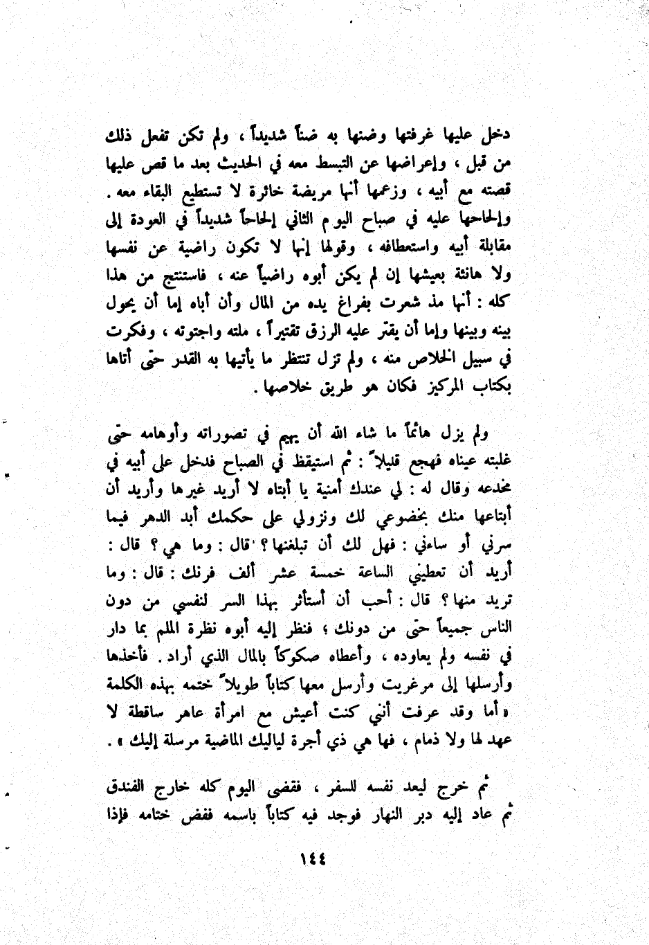 وَلَمْ يَزَلْ هَائِمًا مَا شَاءَ اَللَّه أَنْ يَهِيم فِي تَصَوُّرَاته وَأَوْهَامه حَتَّى غَلَبَته فَهَجَعَ قَلِيلًا ثُمَّ اِسْتَيْقَظَ فِي اَلصَّبَاح فَدَخَلَ عَلَى أَبِيهِ فِي مَخْدَعه وَقَالَ لَهُ لِي عِنْدك أُمْنِيَة يَا أَبَتَاهُ لَا أُرِيد غَيْرهَا وَأُرِيد أَنْ أَبْتَاعهَا مِنْك بِخُضُوعِي لَك وَنُزُولِي عَلَى حُكْمك أَبَد اَلدَّهْر فِيمَا سَرَّنِي أَوْ سَاءَنِي فَهَلْ لَك أَنْ تبلغنها قَالَ وَمَا هِيَ قَالَ أُرِيد أَنْ تُعْطِينِي اَلسَّاعَة خَمْسَة عَشَر أَلْف فِرَنْك قَالَ وَمَا تُرِيد مِنْهَا قَالَ أَحَبّ أَنْ أَسْتَأْثِر بِهَذَا اَلسِّرّ لِنَفْسِي مِنْ دُون اَلنَّاس جَمِيعًا حَتَّى مِنْ دُونك فَنَظَرَ إِلَيْهِ أَبُوهُ نَظْرَة اَلْمُلِمّ بِمَا دَارَ فِي نَفْسه وَلَمْ يُعَاوِدهُ وَأَعْطَاهُ صُكُوكًا بِالْمَالِ اَلَّذِي أَرَادَ فَأَخَذَهَا وَأَرْسَلَهَا إِلَى مَرْغِرِيت وَأَرْسَلَ مَعَهَا كِتَابًا طَوِيلًا خَتَمَهُ بِهَذِهِ اَلْكَلِمَة أَمَّا قَدْ عَرَفَتْ أَنَّنِي كُنْت أَعِيش مَعَ اِمْرَأَة عَاهِر سَاقِطَة لَا أَمَّا وَقَدْ عَرَفَتْ أَنَّنِي كُنْت أَعِيش مَعَ اِمْرَأَة عَاهِر سَاقِطَة لَا عُهَد لَهَا وَلَا ذمام فَهَا هِيَ ذِي أُجْرَة لَيَالِيك اَلْمَاضِيَة مُرْسَلَة إِلَيْك.