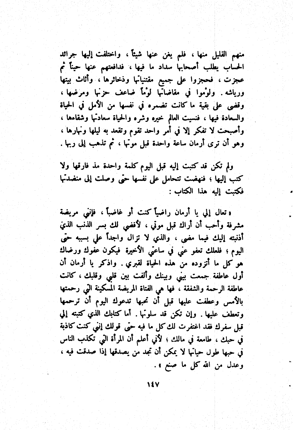 وَلَمْ تَكُنْ قَدْ كَتَبَتْ إِلَيْهِ قَبْل اَلْيَوْم كَلِمَة وَاحِدَة مُنْذُ فَارَقَهَا وَلَا كُتُب إِلَيْهَا فَنَهَضَتْ تَتَحَامَل عَلَى نَفْسهَا حَتَّى وَصَلَتْ إِلَى مِنْضَدَتهَا فَكَتَبَتْ إِلَيْهِ هَذَا اَلْكِتَاب تَعَالٍ إِلَى يَا أَرْمَان رَاضِيًا كُنْت أَوْ غَاضِبًا فَإِنَّنِي مَرِيضَة مُشَرِّفَة وَأَحَبَّ أَنْ أَرَاك قَبْل مَوْتَى لِأَقْضِيَ لَك بِسِرّ اَلذَّنْب اَلَّذِي أذنبته إِلَيْك فِيمَا مَضَى وَاَلَّذِي لَا تَزَال واجدا عَلَى بِسَبَبِهِ حَتَّى اَلْيَوْم فَلَعَلَّك تَعْفُو عَنِّي فِي سَاعَتِي اَلْأَخِيرَة فَيَكُون عَفْوك وَرِضَاك هُوَ كُلّ مَا أتزوده مِنْ هَذِهِ اَلْحَيَاة لِقَبْرِي وَاذْكُرْ يَا أَرْمَان أَنَّ أَوَّل عَاطِفَة جَمَعَتْ بَيْنِي وَبَيْنك وَأَلَّفَتْ بَيْن قَلْبِي وَقَلْبك كَانَتْ عَاطِفَة اَلرَّحْمَة وَالشَّفَقَة فَهَا هِيَ اَلْفَتَاة اَلْمَرِيضَة اَلْمِسْكِينَة اَلَّتِي رَحِمَتْهَا بِالْأَمْسِ وَعَطَفَتْ عَلَيْهَا قَبْل أَنْ تُحِبّهَا تَدْعُوك اَلْيَوْم أَنْ تَرْحَمهَا وَتَعْطِف عَلَيْهَا وَإِنَّ تُكِنّ قَدْ سَلْوَتهَا أَمَّا كِتَابك اَلَّذِي كَتَبَتْهُ إِلَيَّ قَبْل سَفَرك فَقَدْ اغتفرت لَك كُلّ مَا فِيهِ حَتَّى قَوْلك إِنَّنِي كُنْت كَاذِبَة فِي حُبُك طَامِعَة فِي مَالِك لِأَنِّي أَعْلَم أَنَّ اَلْمَرْأَة اَلَّتِي كَذَبَ اَلنَّاس فِي حُبّهَا طَوَال حَيَاتهَا لَا يُمْكِن أَنْ تَجِد مَنْ يُصَدِّقهَا إِذْ صَدَقَتْ فِيهِ وَعَدَّلَ مِنْ اَللَّه كُلّ مَا صَنَعَ.