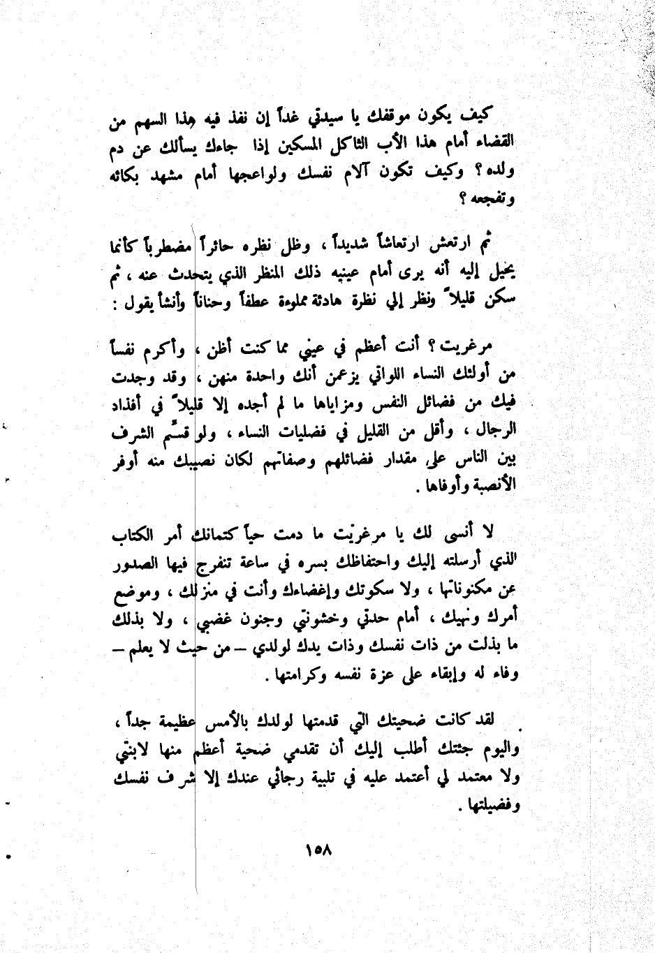 لَقَدْ كَانَتْ ضَحِيَّتك اَلَّتِي قَدَّمَتْهَا لِوَلَدِك بِالْأَمْسِ عَظِيمَة جِدًّا وَالْيَوْم جِئْتُك أَطْلُب إِلَيْك أَنْ تُقَدِّمِي ضَحِيَّة أَعْظَم مِنْهَا لِابْنَتِي وَلَا مُعْتَمِد لِي أَعْتَمِد عَلَيْهِ فِي تَلْبِيَة رَجَائِي عِنْدك إِلَّا شَرَف نَفْسك وَفَضِيلَتهَا.