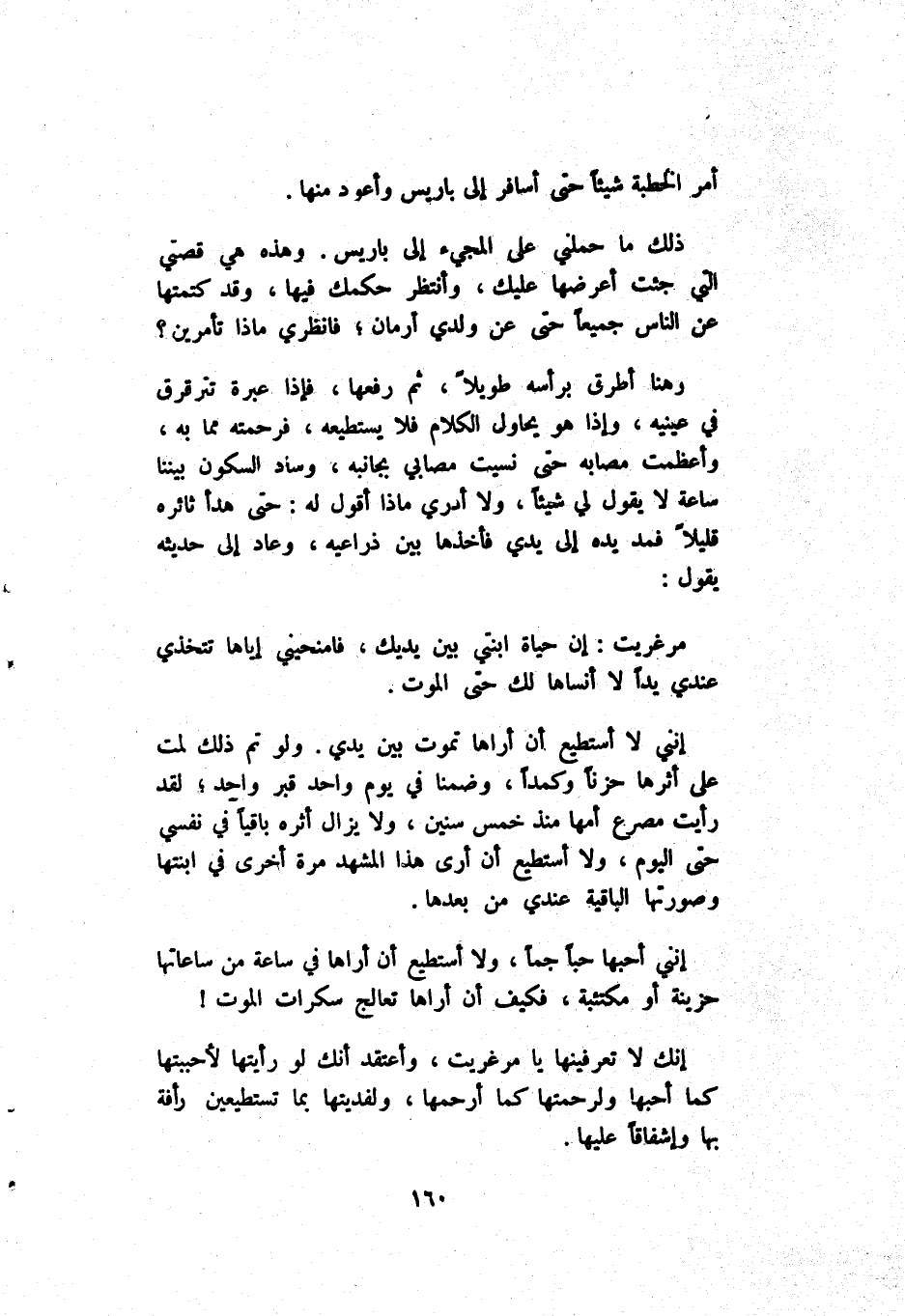 وَهُنَا أَطْرُق بِرَأْسِهِ طَوِيلًا ثُمَّ رَفَعَهَا فَإِذَا عَبْرَة تَتَرَقْرَق فِي عَيْنَيْهِ وَإِذَا هُوَ يُحَاوِل اَلْكَلَام فَلَا يَسْتَطِيعهُ فَرَحْمَته مِمَّا بِهِ وَأَعْظَمَتْ مُصَابه حَتَّى نَسِيَتْ مُصَابِي بِجَانِبِهِ وَسَادَ اَلسُّكُون بَيْننَا سَاعَة لَا يوقل لِي شَيْئًا وَلَا أَدْرِي مَاذَا أَقُول لَهُ حَتَّى هَدَأَ ثَائِره قَلِيلًا فَمَدَّ يَده إِلَى يَدِي فَأَخَذَهَا بَيْن ذِرَاعَيْهِ وَعَاد إِلَى حَدِيثه يَقُول: