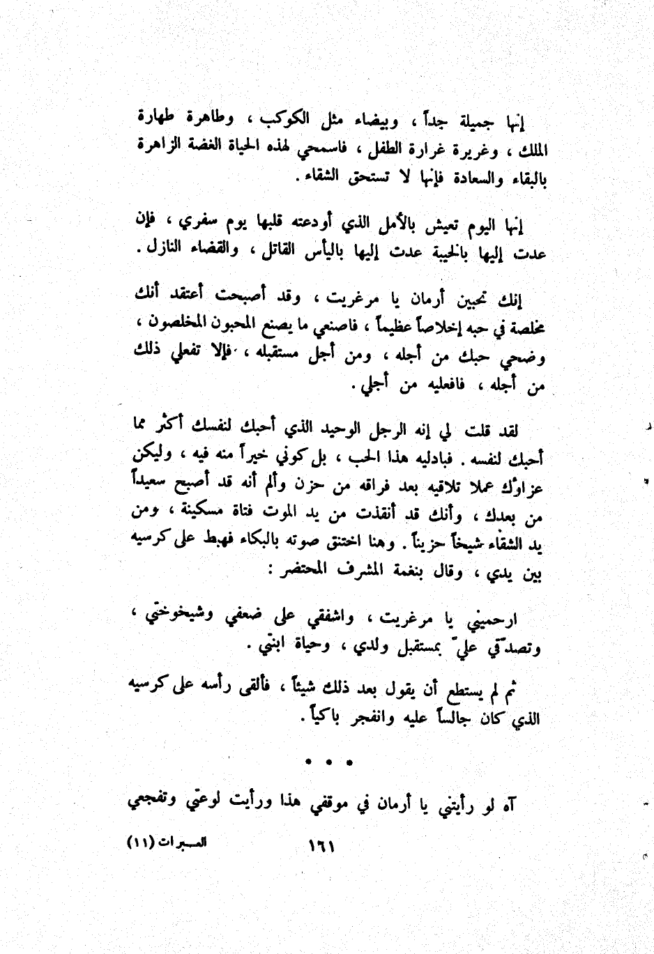 إِنَّك تُحِبِّينَ أَرْمَان يَا مَرْغِرِيت وَقَدْ أَصْبَحَتْ أَعْتَقِد أَنَّك مُخْلِصَة فِي حُبّه إِخْلَاصًا عَظِيمًا فَاصْنَعِي مَا يَصْنَع اَلْمُحِبُّونَ اَلْمُخْلِصُونَ وَضَحِّي حُبّك مِنْ أَجْله وَمِنْ أَجْل مُسْتَقْبَله فَإِلَّا تَفْعَلِي ذَلِكَ مِنْ أَجْله فَافْعَلِيهِ مِنْ أَجْلِي.
