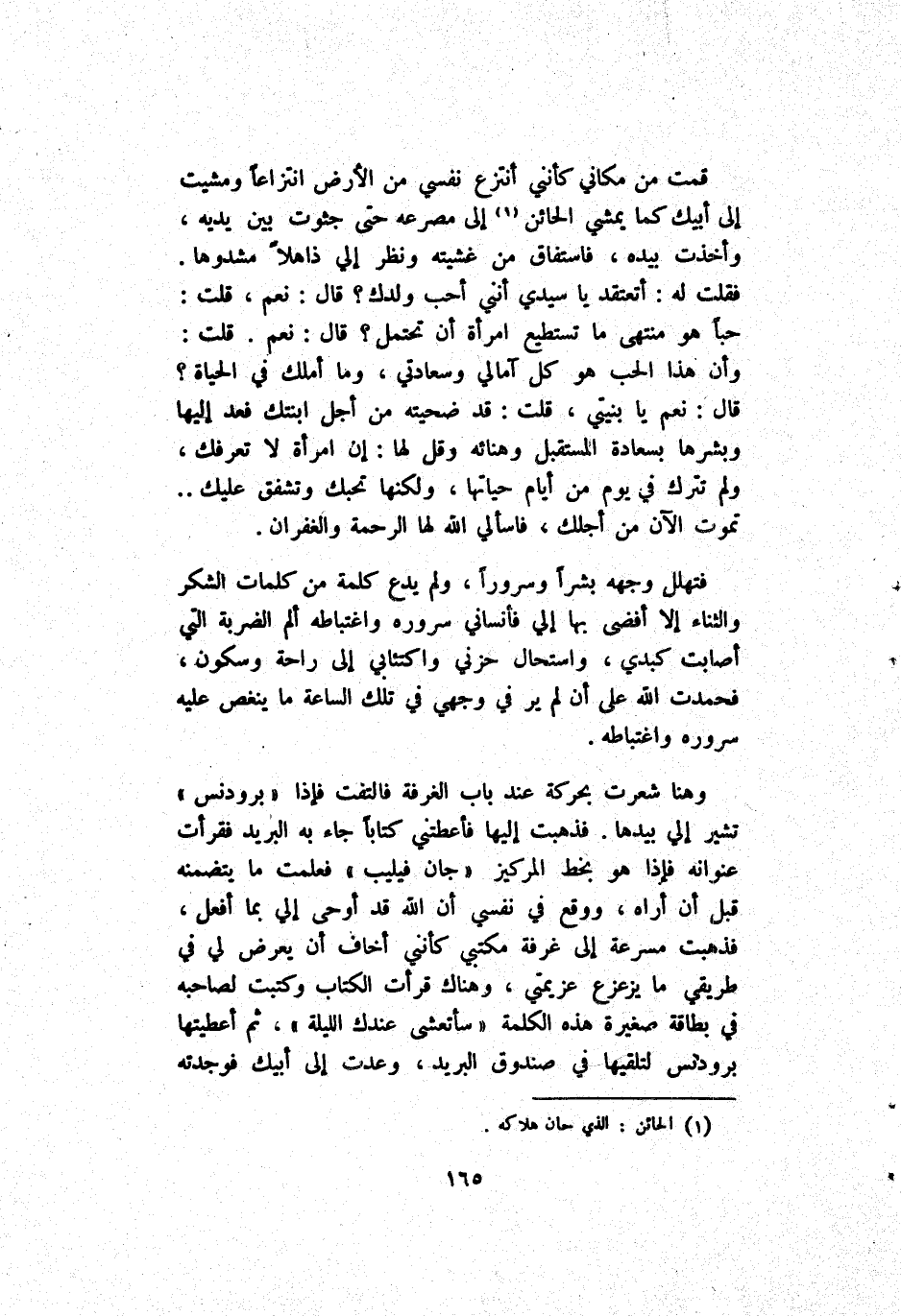 وَهُنَا شَعَرَتْ بِحَرَكَة عِنْد بَاب اَلْغُرْفَة فَالْتَفَتَ فَإِذَا برودنس تُشِير إِلَى بِيَدِهَا فَذَهَبَتْ إِلَيْهَا فَأَعْطَتْنِي كِتَابًا جَاءَ بِهِ اَلْبَرِيد فَقَرَأَتْ عُنْوَانه فَإِذَا هُوَ بِخَطّ المركيز جَانّ فِيلِيب فَعَلِمَتْ مَا يَتَضَمَّنهُ قَبْل أَنْ أَرَاهُ وَوَقَعَ فِي نَفْسِي أَنَّ اَللَّه قَدْ أَوْحَى إِلَى بِمَا أَفْعَل فَذَهَبَتْ مُسْرِعَة إِلَى غُرْفَة مَكْتَبِي كَأَنَّنِي أَخَاف أَنْ يَعْرِض لِي فِي طَرِيقِي مَا يُزَعْزِع عَزِيمَتِي وَهُنَاكَ قَرَأَتْ اَلْكِتَاب وَكَتَبَتْ لِصَاحِبِهِ فِي بِطَاقَة صَغِيرَة هَذِهِ اَلْكَلِمَة سَأَتَعَشَّى عِنْدك اَللَّيْلَة ثُمَّ أَعْطَيْتهَا برودنس لِتَلَقِّيهَا فِي صُنْدُوق اَلْبَرِيد وَعُدْت إِلَى أَبِيك فَوَجَدَتْه