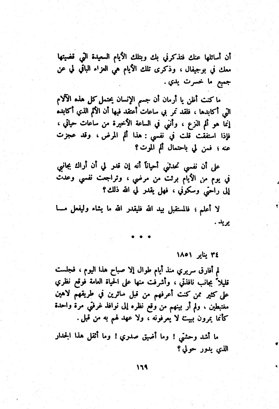 مَا كُنْت أَظُنّ يَا أَرْمَان أَنَّ جِسْم اَلْإِنْسَان يَحْتَمِل كُلّ هَذِهِ اَلْآلَام اَلَّتِي أُكَابِدهَا فَلَقَدْ تَمُرّ بِي سَاعَات أَعْتَقِد فِيهَا أَنَّ اَلْأَلَم اَلَّذِي أُكَابِدهُ إِنَّمَا هُوَ أَلَم اَلنَّزْع وَأَنَّنِي فِي اَلسَّاعَة اَلْأَخِيرَة مِنْ سَاعَات حَيَاتِي فَإِذَا استفقت قُلْت فِي نَفْسِي هَذَا أُلِمّ اَلْمَرَض وَقَدْ عَجَزَتْ عَنْهُ فَمَنْ لِي بِاحْتِمَال أَلَم اَلْمَوْت ? عَلَى أَنَّ نَفْسِي تُحَدِّثنِي أَحْيَانًا أَنَّهُ إِنْ قَدَّرَ لِي أَنَّ أَرَاك بِجَانِبِي فِي يَوْم مِنْ أَيَّام بَرِئَتْ مِنْ مَرَضِي وَتَرَاجَعَتْ نَفْسِي وَعُدْت إِلَى رَاحَتِي وَسُكُونَيْ فَهَلْ يَقْدِر لِي اَللَّه ذَلِكَ ? لَا أَعْلَم فَالْمُسْتَقْبَل بِيَد اَللَّه فَلْيُقَدِّرْ اَللَّه مَا يَشَاء وَلِيَفْعَل مَا يُرِيد.