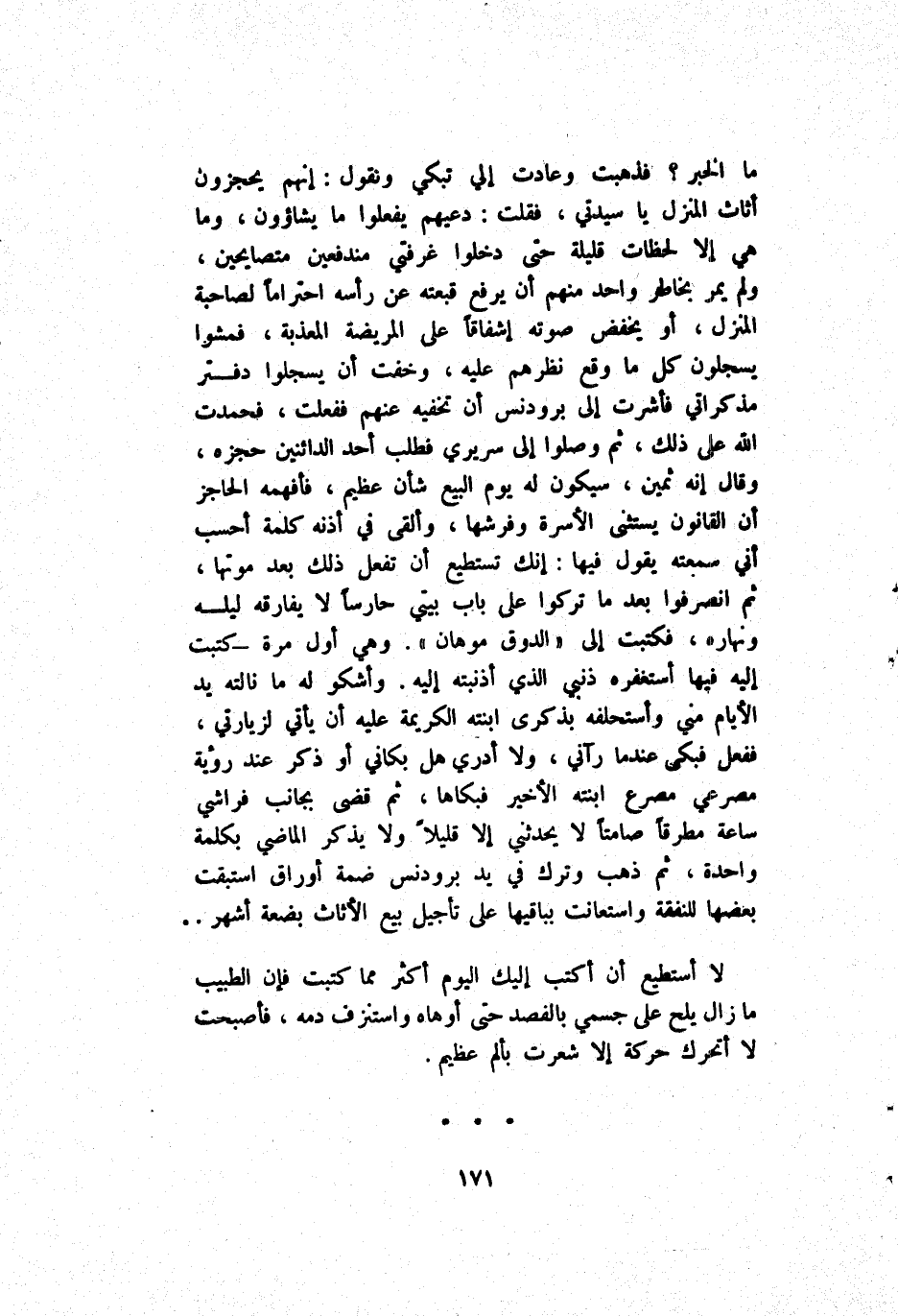 مَا اَلْخَبَر فَذَهَبَتْ وَعَادَتْ إِلَى تَبْكِي وَتَقُول إِنَّهُمْ يَحْجِزُونَ أَثَاث اَلْمَنْزِل يَا سَيِّدَتِي فَقُلْت دعيهم يَفْعَلُونَ مَا يشاؤون وَمَا هِيَ إِلَّا لَحَظَات قَلِيلَة حَتَّى دَخَلُوا غُرْفَتَيْ مُنْدَفِعِينَ متصايحين وَلَمْ يَمُرّ بِخَاطِر وَاحِد مِنْهُمْ أَنْ يَرْفَع قُبَّعَته عَنْ رَأْسه اِحْتِرَامًا لِصَاحِبَة اَلْمَنْزِل أَوْ يَخْفِض صَوْته إِشْفَاقًا عَلَى اَلْمَرِيضَة اَلْمُعَذَّبَة فَمَشَوْا يُسَجِّلُونَ كُلّ مَا وَقَعَ نَظَرهمْ عَلَيْهِ وَخَفَتَ أَنْ يُسَجِّلُوا دَفْتَر مُذَكِّرَاتِي فَأَشَرْت إِلَى برودنس أَنَّ تَخَفِّيه عَنْهُمْ فَفَعَلَتْ فَحَمِدَتْ اَللَّه عَلَى ذَلِكَ ثُمَّ وَصَلُوا إِلَى سَرِيرِي فَطَلَب أَحَد اَلدَّائِنِينَ حَجَزَهُ وَقَالَ إِنَّهُ ثَمِين سَيَكُونُ لَهُ يَوْم اَلْبَيْع شَأْن عَظِيم فَأَفْهَمَهُ اَلْحَاجِز أَنَّ اَلْقَانُون يَسْتَثْنِي اَلْأُسْرَة وَفَرَشَهَا وَأُلْقِي فِي أُذُنه كَلِمَة أَحْسَب أَنِّي سَمِعْته يَقُول فِيهَا إِنَّك تَسْتَطِيع أَنْ تَفْعَل ذَلِكَ بَعْد مَوْتهَا ثُمَّ اِنْصَرَفُوا بَعْد مَا تَرَكُوا عَلَى بَاب بَيْتِيّ حَارِسًا لَا يُفَارِقهُ لَيْله وَنَهَاره كَتَبَتْ إِلَى اَلدُّوق موهان وَهِيَ أَوَّل مَرَّة كَتَبَتْ إِلَيْهِ فِيهَا أَسْتَغْفِر ذَنْبِي اَلَّذِي أذنبته إِلَيْهِ واشكو لَهُ مَا نَالَتْهُ يَد اَلْأَيَّام مِنِّي وَأَسْتَحْلِفهُ بِذِكْرَى اِبْنَته اَلْكَرِيمَة عَلَيْهِ أَنْ يَأْتِي لِزِيَارَتِي فَفَعَلَ فَبَكَى عِنْدَمَا رَآنِي وَلَا أَدْرِي هَلْ بَكَانِي أَوْ ذَكَّرَ عِنْد رُؤْيَة مصرعي مَصْرَع اِبْنَته اَلْأَخِير فَبَكَاهَا ثُمَّ قُضِيَ بِجَانِب فِرَاشَيْ سَاعَة مُطْرِقًا صَامِتًا لَا يُحَدِّثنِي إِلَّا قَلِيلًا وَلَا يُذَكِّر اَلْمَاضِي بِكَلِمَة وَاحِدَة ثُمَّ ذَهَبَ وَتَرَكَ فِي يَد برودنس ضَمَّة أَوْرَاق اِسْتَبْقَتْ بَعْضهَا لِلنَّفَقَةِ وَاسْتَعَانَتْ بِالْإِغْوَاءِ عَلَى تَأْجِيل بَيْع اَلْأَثَاث بِضْعَة أَشْهُر.