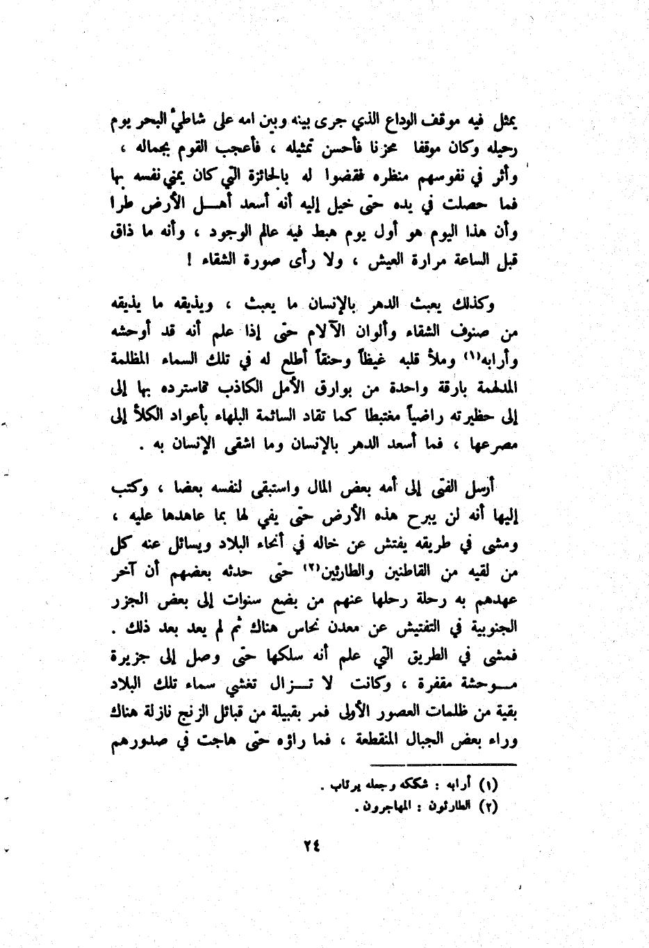 أَرْسَلَ اَلْفَتَى إِلَى أُمّه بَعْض اَلْمَال وَاسْتَبْقَى لِنَفْسِهِ بَعْضًا وَكَتَبَ إِلَيْهَا أَنَّهُ لَنْ يَبْرَح هَذِهِ اَلْأَرْض حَتَّى يَفِي لَهَا بِمَا عَاهَدَهَا عَلَيْهِ وَمَشَى فِي طَرِيقه يُفَتِّش عَنْ خَاله فِي أَنْحَاء اَلْبِلَاد وَيُسَائِل عَنْهُ كُلّ مَنْ لَقِيَهُ مِنْ اَلْقَاطِنِينَ وَالطَّارِئَيْنِ وَحَتَّى حَدَّثَهُ بَعْضهمْ أَنَّ آخِر عَهْدهمْ بِهِ رِحْلَة رَحْلهَا عَنْهُمْ مِنْ بِضْع سَنَوَات إِلَى بَعْض اَلْجُزُر اَلْجَنُوبِيَّة فِي اَلتَّفْتِيش عَنْ مَعْدِن نُحَاس هُنَاكَ ثُمَّ لَمْ عَدّ بَعْد ذَلِكَ فَمَشَى فِي اَلطَّرِيق اَلَّتِي عَلِمَ أَنَّهُ سَلَكَهَا حَتَّى وَصَلَ إِلَى جَزِيرَة مُوحِشَة مُقْفِرَة وَكَانَتْ لَا تَزَال تَغُشِّي سَمَاء تِلْكَ اَلْبِلَاد بَقِيَّة مِنْ ظُلُمَات اَلْعُصُور اَلْأَوْلَى فَمَرَّ بِقَبِيلَة مِنْ قَبَائِل اَلزِّنْج نَازِلَة هُنَاكَ وَرَاء بَعْض اَلْجِبَال اَلْمُنْقَطِعَة فَمَا رَاؤُهُ حَتَّى هَاجَتْ فِي صُدُورهمْ