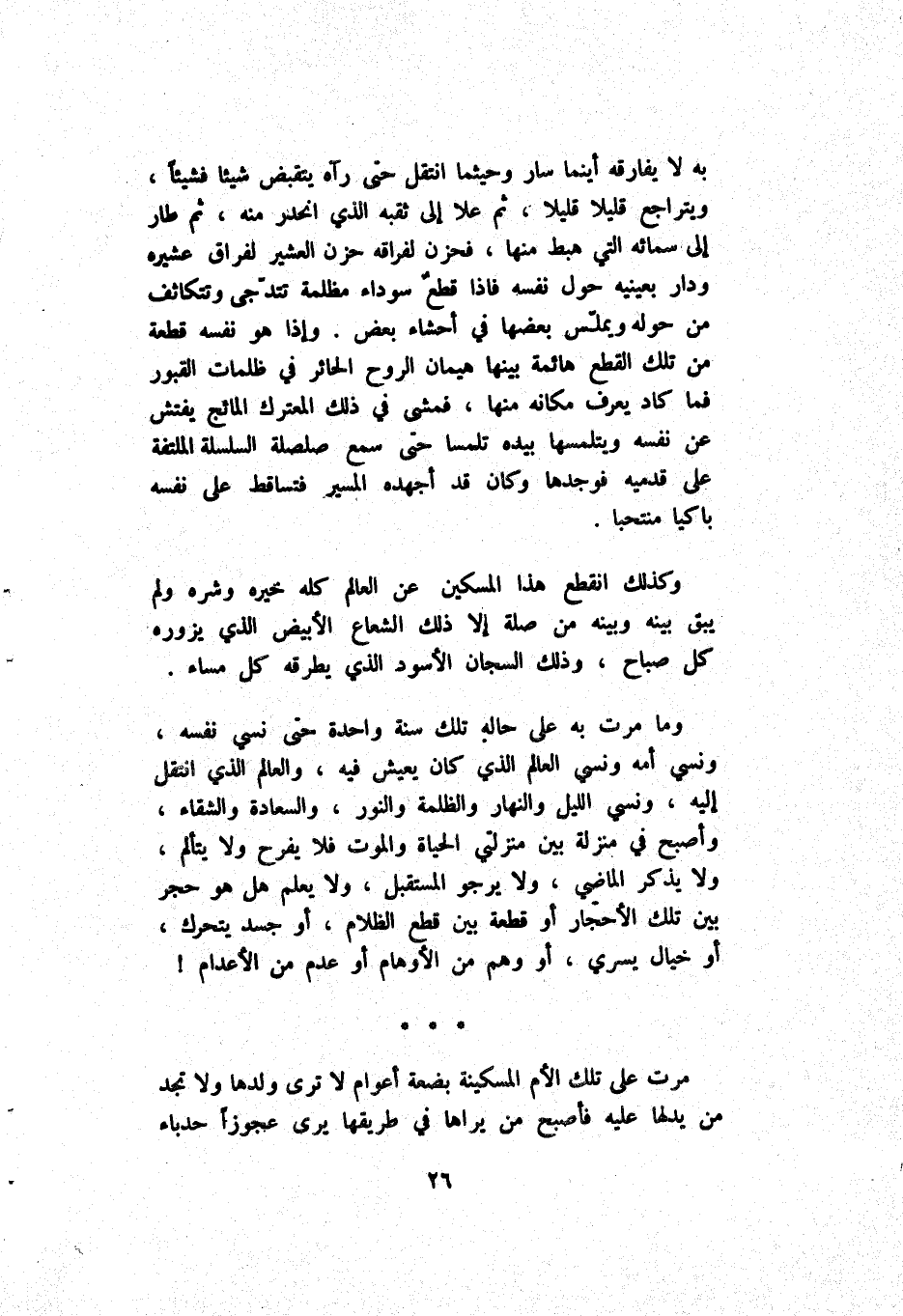 وَمَا مَرَّتْ بِهِ عَلَى حَاله تِلْكَ سَنَة وَاحِدَة حَتَّى نَسَّى نَفْسه وَنَسِيَ أَمَّهُ وَنَسِيَ اَلْعَالِم اَلَّذِي كَانَ يَعِيش فِيهِ وَالْعَالِم اَلَّذِي اِنْتَقَلَ إِلَيْهِ وَنَسِيَ اَللَّيْل وَالنَّهَار وَالظُّلْمَة وَالنُّور وَالسَّعَادَة وَالشَّقَاء وَأَصْبَحَ فِي مَنْزِلَة بَيْن مَنْزِلَتِي اَلْحَيَاة وَالْمَوْت فَلَا يُفْرِح وَلَا يَتَأَلَّم وَلَا يُذَكِّر اَلْمَاضِي وَلَا يَرْجُو اَلْمُسْتَقْبَل وَلَا يَعْلَم هَلْ هُوَ حَجَر بَيْن تِلْكَ اَلْأَحْجَار أَوْ قِطْعَة بَيْن قِطَع اَلظَّلَام أَوْ جَسَد يَتَحَرَّك أَوْ خَيَال يُسْرِيّ أَوْ وَهُمْ مِنْ اَلْأَوْهَام أَوْ عَدَم مِنْ اَلْإِعْدَام! مَرَّتْ عَلَى تِلْكَ اَلْأُمّ اَلْمِسْكِينَة بِضْعَة أَعْوَام لَا تَرَى وَلَدهَا وَلَا تَجِد مَنْ يَدُلّهَا عَلَيْهِ فَأَصْبَحَ مَنْ يَرَاهَا فِي طَرِيقهَا يَرَى عَجُوزًا حَدْبَاء
