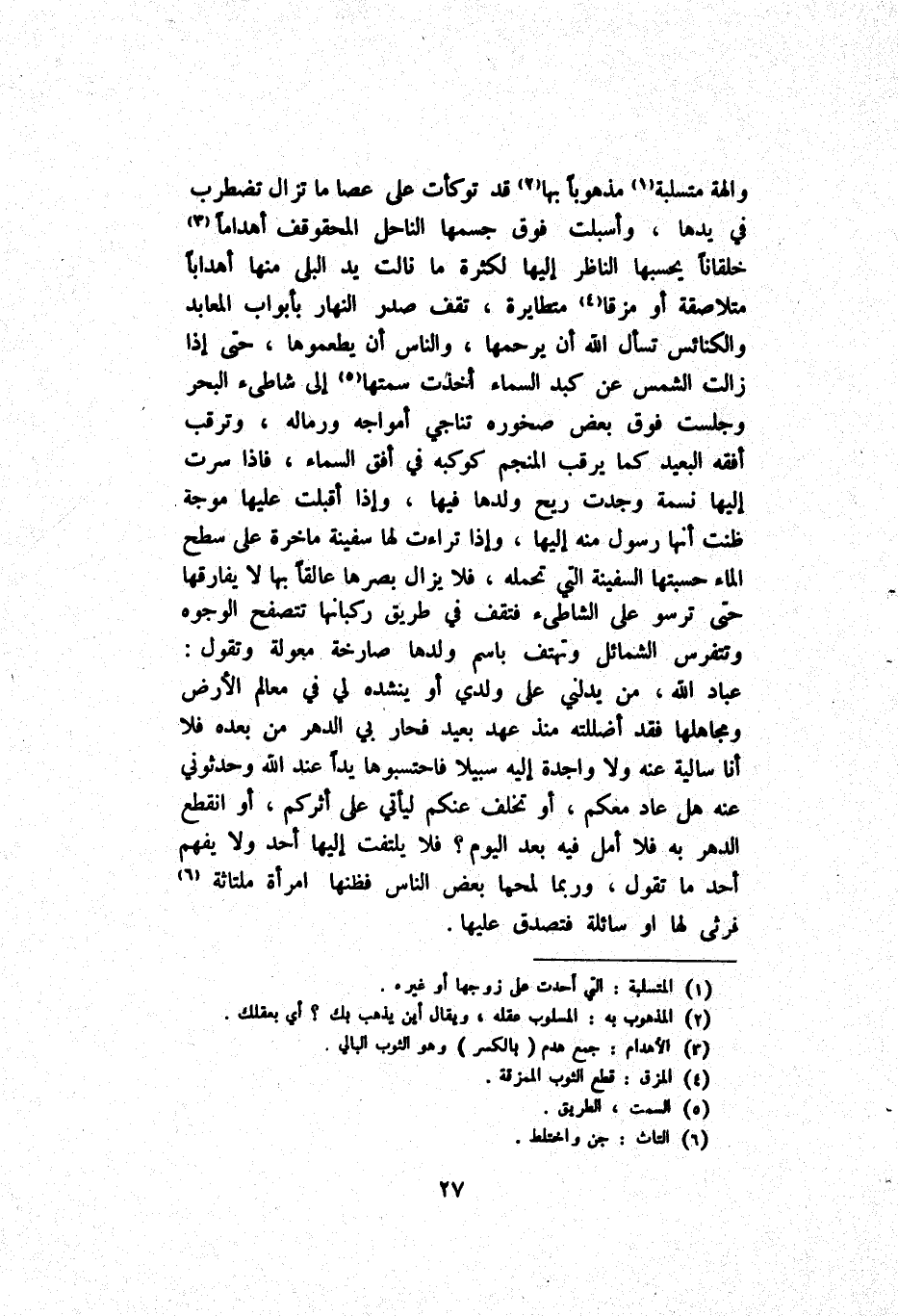 عِبَاد اَللَّه مَنْ يَدُلّنِي عَلَى وَلَدِي أَوْ يَنْشُدهُ لِي فِي مَعَالِم اَلْأَرْض وَمَجَاهِلهَا فَقَدْ أَضْلَلْته مُنْذُ عَهْد بَعِيد فَحَارَ بِي اَلدَّهْر مِنْ بَعْده فَلَا أَنَا سالية عَنْهُ وَلَا واجدة إِلَيْهِ سَبِيلًا فَاحْتَسَبُوهَا يَدًا عِنْد اَللَّه وَحَدَّثُونِي عَنْهُ هَلْ عَادَ مَعَكُمْ أَوْ تَخَلَّفَ عَنْكُمْ لِيَأْتِيَ عَلَى أَثَركُمْ أَوْ اِنْقَطَعَ اَلدَّهْر بِعْ فَلَا أَمَل فِيهِ بَعْد اَلْيَوْم فَلَا يَلْتَفِت إِلَيْهَا أَحَد وَلَا يَفْهَم أَحَد مَا تَقُول وَرُبَّمَا لَمَحَهَا بَعْض اَلنَّاس فَظَنَّهَا اِمْرَأَة ملتاثة فَرَثَى لَهَا أَوْ سَائِلَة فَتُصَدِّق عَلَيْهَا.