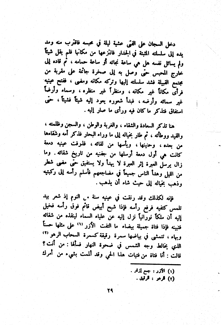 فَإِنَّهُ لكذلك وَقَدْ رنقت فِي عَيْنَيْهِ سِنَة مِنْ اَلنَّوْم إِذْ شَعَرَ بِيَد تَلَمُّس كَتِفَيْهِ فَرَفَعَ رَأْسه فَإِذَا شَبَح أَبْيَض قَائِم فَوْق رَأْسه فَخُيِّلَ إِلَيْهِ أَنَّ مَلَكًا نُورَانِيًّا نَزَلَ إِلَيْهِ عَنْ عَلْيَاء اَلسَّمَاء لِيُنْقِذهُ مِنْ شَقَائِهِ فَتُبَيِّنهُ فَإِذَا فَتَاة جَمِيلَة بَيْضَاء مَا اِلْتَفَّتْ اَلْأَزْر عَلَى مِثْلهَا حُسْنًا وَبَهَاء تَتَمَشَّى فِي بَيَاضهَا سُمْرَة رَقِيقَة كَسُمْرَة اَلسَّحَاب اَلزَّهْو اَلَّذِي يُخَالِط وَجْه اَلشَّمْس فِي ضحوة اَلنَّهَار فَسَأَلَهَا مَنْ أَنْتَ ? قَالَتْ أَنَا فَتَاة مِنْ فَتَيَات هَذَا اَلْحَيّ وَقَدْ أَلْمَمْت بِشَيْء مِنْ أَمْرك