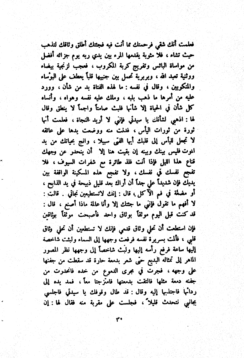 فَعَلِمَتْ أَنَّك شَقِيّ فَرَحْمَتك مِمَّا أَنْتِ فِيهِ فَجِئْتُك أَطْلَقَ وِثَاقك لِتَذْهَب حَيْثُ تَشَاء فَلَا مَثُوبَة يُقَدِّمهَا اَلْمَرْء بَيْن يَدَيْ رَبّه يَوْم جَزَائِهِ أَفْضَل مِنْ مُوَاسَاة اَلْبَائِس وَتَفْرِيج كُرْبَة المكروب فَعَجِبَ لِزِنْجِيَّة بَيْضَاء وَوَثَنِيَّة تَعْبُد اَللَّه وَبَرْبَرِيَّة تَحْمِل بَيْن جَبِينهَا قَلْبًا يَعْطِف عَلَى اَلْبُؤَسَاء وَالْمَنْكُوبِينَ وَقَالَ فِي نَفْسه مَا لِهَذِهِ اَلْفَتَاة بُدّ مِنْ شَأْن وَوَرْد عَلَيْهِ مِنْ أَمْرهَا مَا ذَهَبَ بِلُبِّهِ وَمَلِك عَلَيْهِ نَفْسه وَهَوَاهُ وَأَنْسَاهُ كُلّ شَأْن فِي اَلْحَيَاة إِلَّا شَأْنهَا فَلَبِثَ صَامِتًا وَاجِمًا لَا يَنْطِق وَقَالَ لَهَا اِذْهَبِي لِشَأْنِك يَا سَيِّدَتِي فَإِنَّنِي لَا أُرِيد اَلنَّجَاة فَعَلِمَتْ أَنَّهَا ثَوْرَة مِنْ ثَوْرَات اَلْيَأْس فَدَنَتْ مِنْهُ وَوَضَعَتْ يَدهَا عَلَى عاتقة لَا تَجْعَل لِلْيَأْسِ إِلَى قَلْبك أَيُّهَا اَلْفَتَى سَبِيلًا وَانْجُ بِحَيَاتِك مِنْ يَد اَلْمَوْت فَلَيْسَ بَيْنك وَبَيْنه إِنْ بَقِيَتْ هُنَا إِلَّا أَنْ يَنْحَدِر عَنْ وَجْهك قِنَاع هَذَا اَللَّيْل فَإِذَا أَنْتَ فَلَذَّ طَائِرَة مَعَ شَفَرَات اَلسُّيُوف فَلَا تُفْجِع نَفْسك فِي نَفْسك وَلَا تُفْجِع هَذِهِ اَلْمِسْكِينَة اَلْوَاقِفَة بَيْن يَدَيْك فَإِنَّ شَدِيدًا عَلَى جِدًّا أَنْ أَرَاك بَعْد قَلِيل ذَبِيحَة فِي يَد الأبح أَوْ مُضْغَة فِي فَم اَلْآكِل قَالَ إِنَّك لَا تَسْتَطِيعِينَ نَجَاتِي قَالَتْ لَا أَفْهَم مَا تَقُول فَإِنَّنِي مَا جِئْتُك إِلَّا وَأَنَا عَالِمَة مَاذَا أَصْنَع قَالَ قَدْ كُنْت قَبْل اَلْيَوْم مُوثَقًا بِوِثَاق وَاحِد فَأَصْبَحَتْ مُوثَقًا بِوِثَاقَيْنِ فَانٍ اِسْتَطَعْت أَنْ تُحَلَّى وِثَاق قَدَمِي فَإِنَّك لَا تَسْتَطِيعِينَ أَنْ تَحِلِّي وِثَاق قَلْبِي فَأَلَمَّتْ بِسَرِيرَة نَفْسه فَرَفَعَتْ وَجْههَا إِلَى اَلسَّمَاء وَلَبِثَتْ شَاخِصَة إِلَيْهَا سَاعَة فَرَفَعَ رَأَسَهُ إِلَيْهَا وَلَبِثَ شَاخِصًا إِلَى وَجْههَا نَظَر اَلْمُصَوِّر اَلْمَاهِر إِلَى تِمْثَاله اَلْبَدِيع حَتَّى شَعَرَ بِدَمْعَة حَارَّة قَدْ سَقَطَتْ مِنْ جَفْنهَا عَلَى وَجْهه فَجَرَتْ فِي مَجْرَى اَلدُّمُوع مِنْ خَدّه فَانْحَدَرَتْ مِنْ جَفْنه دَمْعَة مِثْلهَا فَالْتَقَتْ بِدَمْعَتِهَا فَامْتَزَجَتَا مَعًا فَمَدَّ يَده إِلَى رِدَائِهَا بِالْإِغْوَاءِ إِلَيْهِ وَقَالَ قَدْ طَالَ وُقُوفك يَا سَيِّدَتِي فَاجْلِسِي بِجَانِبِي نَتَحَدَّث قَلِيلًا فَجَلَسَتْ عَلَى مَقْرُبَة مِنْهُ فَقَالَ لَهَا إِنَّ