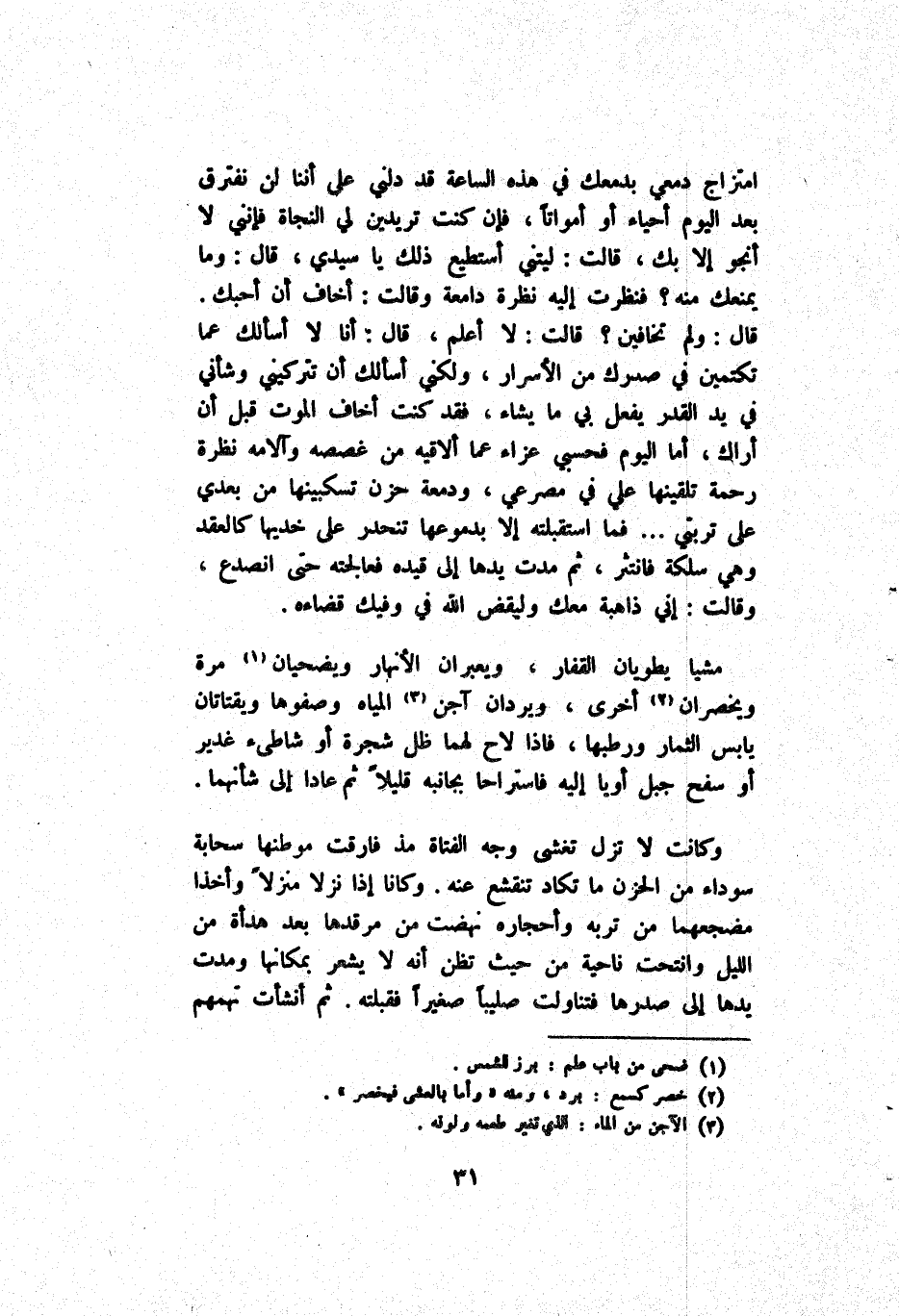 اِمْتِزَاج دَمْعِي بِدَمْعِك فِي هَذِهِ اَلسَّاعَة قَدْ دَلَّنِي عَلَى أَنَّنَا لَنْ تَفْتَرِق بَعْد اَلْيَوْم أَحْيَاء أَوْ أَمْوَاتًا فَإِنْ كُنْت تُرِيدِينَ لِي اَلنَّجَاة فَإِنَّنِي لَا أَنْجُو إِلَّا بِك قَالَتْ لَيْتَنِي أَسْتَطِيع ذَلِكَ يَا سَيِّدِي قَالَ وَمَا يَمْنَعك مِنْهُ فَنَظَرَتْ إِلَيْهِ نَظْرَة دَامِعَة وَقَالَتْ أَخَافَ أَنْ أُحِبّك قَالَ وَلِمَ تَخَافِينَ قَالَتْ لَا أَعْلَم قَالَ أَنَا لَا أَسْأَلك عَمَّا تَكْتُمِينَ فِي صَدْرك مِنْ اَلْأَسْرَار وَلَكِنِّي أَسْأَلك أَنْ تَتْرُكِينِي وَشَأْنِي فِي يَد اَلْقَدْر يَفْعَل بِي مَا يَشَاء فَقَدْ كُنْت أَخَاف اَلْمَوْت قَبْل أَنْ أَرَاك أَمَّا اَلْيَوْم فَحَسْبِي عَزَاء عَمَّا أُلَاقِيه مِنْ غصصه وَآلَامه نَظْرَة رَحْمَة تَلْقِينهَا عَلَيَّ فِي مصرعي وَدَمْعَة حُزْن تَسْكُبِينَهَا مِنْ بَعْدِي عَلَى تُرْبَتِي فَمَا اِسْتَقْبَلَتْهُ إِلَّا بِدُمُوعِهَا تَنْحَدِر عَلَى خَدَّيْهَا كَالْعُقَدِ وَهِيَ سلكة فَانْتَثَرَ ثُمَّ مَدَّتْ يَدهَا إِلَى قَيْده فَعَالَجَتْهُ حَتَّى انصدع وَقَالَتْ إِنِّي ذَاهِبَة مَعَك وَلْيَقْضِ اَللَّه فِي وَفِيك قَضَاءَهُ.