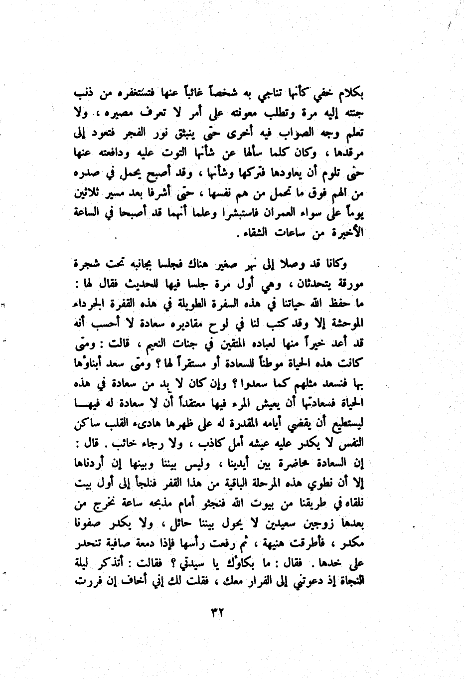 وَكَانَا قَدْ وَصَلَا إِلَى نَهْر صَغِير هُنَاكَ فَجَلَسَا بِجَانِبِهِ تَحْت شَجَرَة مُورِقَة يَتَحَدَّثَانِ وَهِيَ أَوَّل مَرَّة جَلَسَا فِيهَا لِلْحَدِيثِ فَقَالَ لَهَا مَا حَفِظَ اَللَّه حَيَاتنَا فِي هَذِهِ اَلسُّفْرَة اَلطَّوِيلَة فِي هَذِهِ اَلْقَفْزَة اَلْجَرْدَاء اَلْمُوحِشَة إِلَّا وَقَدْ كَتَبَ لَنَا فِي لَوْح مَقَادِيره سَعَادَة لَا أَحْسَب أَنَّهُ قَدْ أَعَدَّ خَيْرًا مِنْهَا لِعِبَادِهِ اَلْمُتَّقِينَ فِي جَنَّات اَلنَّعِيم قَالَتْ وَمَتَى كَانَتْ هَذِهِ اَلْحَيَاة مَوْطِنًا لِلسَّعَادَةِ أَوْ مُسْتَقِرًّا لَهَا وَمَتَّى سَعِدَ أَبْنَاؤُهَا بِهَا فَنُسْعِد مِثْلهمْ كَمَا سَعِدُوا وَإِنْ كَانَ لَابُدَّ مِنْ سَعَادَة فِي هَذِهِ اَلْحَيَاة فَسَعَادَتهَا أَنْ يَعِيش اَلْمَرْء فِيهَا مُعْتَقَدًا أَنْ لَا سَعَادَة لَهُ فِيهَا لِيَسْتَطِيعَ أَنْ يَقْضِي أَيَّامه اَلْمَقْدِرَة لَهُ عَلَى ظَهْرهَا هَادِئ اَلْقَلْب سَاكِن اَلنَّفْس لَا يُكَدِّر عَلَيْهِ عَيْشه أَمَل كَاذِب وَلَا رَجَاء خَائِب قَالَ:
