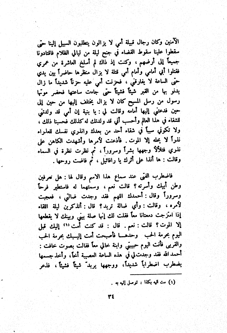 اَلْآمِنِينَ وَكَانَ رِجَال قَبِيلَة أُمِّي لَا يَزَالُونَ يَتَطَلَّبُونَ اَلسَّبِيل إِلَيْنَا حَتَّى سَقَطُوا عَلَيْنَا سُقُوط اَلْقَضَاء فِي جُنْح لَيْلَة مِنْ لَيَالِي اَلظَّلَام فَاقْتَادُونَا جَمِيعًا إِلَى أَرْضهمْ وَكُنْت إِذْ ذَاكَ لَمْ أَسْلَخ اَلْعَاشِرَة مِنْ عمرى فَقَتَلُوا أَبِي وَأُمِّي وَأَمَام أُمَّيْ قَتَلَة لَا يَزَال مَنْظَرهَا حَاضِرًا بَيْن يَدِي حَتَّى اَلسَّاعَة لَا يُفَارِقنِي فَحَزِنَتْ أُمِّي عَلَيْهِ حُزْنًا شَدِيدًا مَا زَالَ يَدْنُو بِهَا مِنْ اَلْقَبْر شَيْئًا فَشَيْئًا حَتَّى جَاءَتْ سَاعَتهَا فَحَضَرَ مَوْتهَا يَدْنُو بِهَا مِنْ اَلْقَبْر شَيْئًا فَسَيِّئًا حَتَّى جَاءَتْ سَاعَتهَا فَحَضَرَ مَوْتهَا رَسُول مِنْ رُسُل اَلْمَسِيح كَانَ لَا يَزَال يَخْتَلِف إِلَيْهَا مِنْ حِين إِلَى حِين فَدَعَتْنِي إِلَيْهَا أَمَامه وَقَالَتْ لِي يَا بِنْيَة إِنَّ أُمِّي قَدْ وَلَدَتْنِي لِلشَّقَاءِ فِي هَذَا اَلْعَالِم وَأَحْسَب أَنِّي قَدْ وَلَّدْتُك لَهُ كَذَلِكَ فَحَسْبنَا ذَلِكَ وَلَا تَكُونِي سَبَبًا فِي شَقَاء أَحَد مِنْ بَعْدك وانذري نَفْسك لِلْعَذْرَاءِ نُذُرًا لَا يُحِلْهُ إِلَّا اَلْمَوْت فَأَذْعَنَتْ لِأَمْرِهَا وَأَشْهَدَتْ اَلْكَاهِن عَلَى نَذْرِي فَتَلَأْلَأَ وَجْههَا بِشْرًا وَسُرُورًا ثُمَّ نَظَرَتْ نَظْرَة فِي اَلسَّمَاء وَقَالَتْ هَا انذا عَلَى أَثَرك يَا رافائيل ثُمَّ فَاضَتْ رُوحهَا.