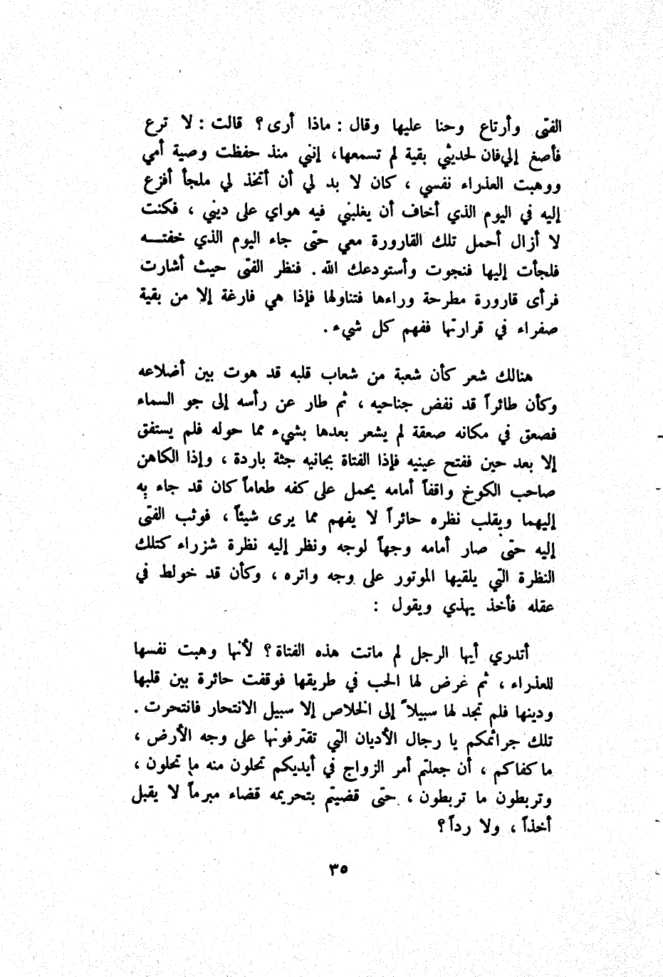 أَتَدْرِي أَيُّهَا اَلرَّجُل لِمَ مَاتَتْ هَذِهِ اَلْفَتَاة لِأَنَّهَا وَهَبَّتْ نَفْسهَا لِلْعَذْرَاءِ ثُمَّ عَرَضَ لَهَا اَلْحُبّ فِي طَرِيقهَا فَوَقَفَتْ حَائِرَة بَيْن قَلْبهَا وَدِينهَا فَلَمْ تَجِد لَهَا سَبِيلًا إِلَى اَلْخَلَاص إِلَّا سَبِيل اَلِانْتِحَار فَانْتَحَرَتْ تِلْكَ جَرَائِمكُمْ يَا رِجَال اَلْأَدْيَان اَلَّتِي تَقْتَرِفُونَهَا عَلَى وَجْه اَلْأَرْض مَا كَفَاكُمْ أَنْ جَعَلْتُمْ أَمْر اَلزَّوَاج فِي أَيْدِيكُمْ تَحِلُّونَ مِنْهُ مَا تَحِلُّونَ وَتَرْبُطُونَ مَا تَرْبُطُونَ حَتَّى قَضَيْتُمْ بِتَحْرِيمِهِ قَضَاء مُبْرَمًا لَا يَقْبَل أَخْذًا وَلَا رَدًّا ?