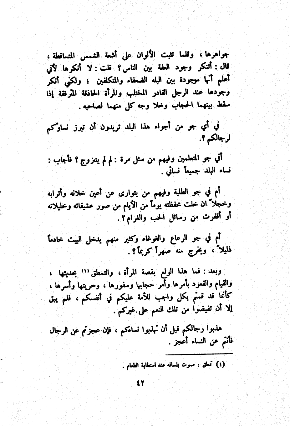 فِي أَيّ جَوّ مِنْ أَجْوَاء هَذَا اَلْبَلَد تُرِيدُونَ أَنْ تَبْرُز نِسَاؤُكُمْ لِرِجَالِكُمْ ? أَفِي جَوّ اَلْمُتَعَلِّمِينَ وَفِيهِمْ مَنْ سُئِلَ مَرَّة لِمَ لَمْ يَتَزَوَّج فَأَجَابَ نِسَاء اَلْبَلَد جَمِيعًا نِسَائِيّ.