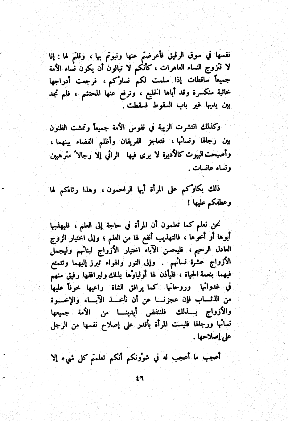 وَكَذَلِكَ اِنْتَشَرَتْ اَلرِّيبَة فِي نُفُوس اَلْأَمَة جَمِيعًا وَتَمَشَّتْ اَلظُّنُون بَيْن رِجَالهَا وَنِسَائِهَا فتعاجز اَلْفَرِيقَانِ وَأَظْلَمَ اَلْفَضَاء بَيْنهمَا وَأَصْبَحَتْ اَلْبُيُوت كَالْأَدْيِرَةِ لَا يَرَى فِيهَا الردائي إِلَّا رِجَالًا مترهبين وَنِسَاء عَانِسَات. ذَلِكَ بُكَاؤُكُمْ عَلَى اَلْمَرْأَة أَيُّهَا اَلرَّاحِمُونَ وَهَذَا رِثَاءَكُمْ لَهَا وَعَطْفكُمْ عَلَيْهَا! نَحْنُ نَعْلَم كَمَا تَعْلَمُونَ أَنَّ اَلْمَرْأَة فِي حَاجَة إِلَى اَلْعِلْم فَلْيُهَذِّبْهَا أَبُوهَا أَوْ أَخُوهَا فَالتَّهْذِيب أَنْفَع لَهَا مِنْ اَلْعِلْم وَإِلَى اِخْتِيَار اَلزَّوْج اَلْعَادِل اَلرَّحِيم فَلْيُحْسِنْ اَلْآبَاء اِخْتِيَار اَلْأَزْوَاج لِبَنَاتِهِمْ وَلِيَجْمُل اَلْأَزْوَاج عِشْرَة نِسَائِهِمْ وَإِلَى اَلنُّور وَالْهَوَاء تَبْرُز إِلَيْهِمَا وَتَتَمَتَّع فِيهِمَا بِنِعْمَة اَلْحَيَاة فَلْيَأْذَنْ لَهَا أَوْلِيَاؤُهَا بِذَلِكَ وَلِيُرَافِقهَا رَفِيق مِنْهُمْ فِي غدواتها وروحاتها كَمَا يُرَافِق اَلشَّاة رَاعِيهَا خَوْفًا عَلَيْهَا مِنْ اَلذِّئَاب فَإِنَّ عَجْزنَا عَنْ أَنْ نَأْخُذ اَلْآبَاء وَالْإِخْوَة وَالْأَزْوَاج بِذَلِكَ فَلْنَنْفُضْ أَيْدِينَا مِنْ اَلْأُمَّة جَمِيعهَا عَلَى إِصْلَاحهَا.