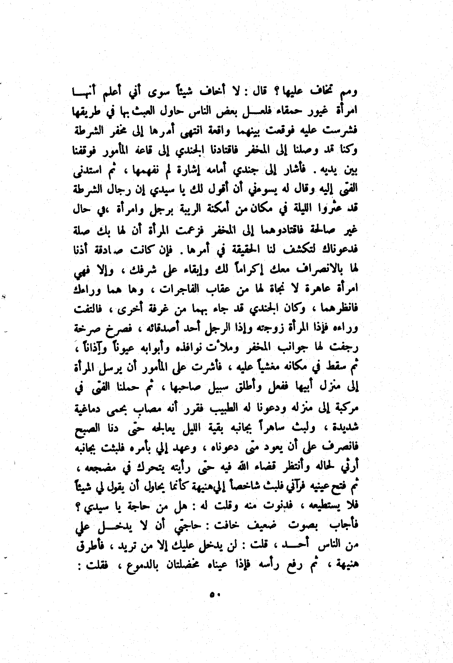 ومم تَخَاف عَلَيْهَا ? قَالَ لَا أَخَاف شَيْئًا سِوَى أَنِّي أَعْلَم أَنَّهَا اِمْرَأَة غَيُور حَمْقَاء فَلَعَلَّ بَعْض اَلنَّاس حَاوَلَ اَلْعَبَث بِهَا فِي طَرِيقهَا فشرست عَلَيْهِ فَوَقَعَتْ بَيْنهمَا وَاقِعَة اِنْتَهِي أَمْرهَا إِلَى مَخْفَر اَلشُّرْطَة وَكُنَّا قَدْ وَصَلْنَا إِلَى اَلْمَخْفَر فَاقْتَادَنَا اَلْجُنْدِيّ إِلَى قَاعَة اَلْمَأْمُور فَوَقَفْنَا وَكُنَّا قَدْ وَصَلْنَا إِلَى اَلْمَخْفَر فَاقْتَادَنَا اَلْجُنْدِيّ إِلَى قَاعَة اَلْمَأْمُور فَوَقَفْنَا بَيْن يَدَيْهِ فَأَشَارَ إِلَى جُنْدِيّ أَمَامه إِشَارَة لَمْ نُفْهِمهَا ثُمَّ استدني اَلْفَتَى إِلَيْهِ وَقَالَ لِي يَسُوءنِي أَنْ أَقُول لَك سَيِّدِي إِنَّ رِجَال اَلشُّرْطَة قَدْ عُثُورًا اَللَّيْلَة فِي مَكَان مِنْ أَمْكِنَة اَلرِّيبَة رَجُل وَاِمْرَأَة فِي مَجَال غَيْر صَالِحَة فَاقْتَادُوهُمَا إِلَى اَلْمَخْفَر فَزَعَمَتْ اَلْمَرْأَة أَنَّ لَهَا بِك صِلَة فَدَعَوْنَاك لِتَكَشُّف لَنَا اَلْحَقِيقَة فِي أَمْرهَا فَإِنْ كَانَتْ صَادِقَة اذنا لَهَا بِالِانْصِرَافِ مَعَك إِكْرَامًا لَاكَ وَإِبْقَاء عَلَى شَرَفك وَإِلَّا فَهِيَ اِمْرَأَة عَاهِرَة لَا نَجَاة لَهَا مِنْ عِقَاب اَلْفَاجِرَات وَهَا هُمَا وَرَاءَك فانظرهما وَكَانَ اَلْجُنْدِيّ قَدْ جَاءَ بِهِمَا مِنْ غُرْفَة أُخْرَى فَالْتَفَتَ وَرَاءَهُ فَإِذَا اَلْمَرْأَة زَوْجَته وَإِذَا اَلرَّجُل أَحَد أَصْدِقَائِهِ فَصَرَخَ صَرْخَة رَجَفَتْ لَهَا جَوَانِب اَلْمَخْفَر وَمَلَأَتْ نَوَافِذه وَأَبْوَابه عُيُونًا وَآذَانًا ثُمَّ سَقَطَ فِي مَكَانه مَغْشِيًّا عَلَيْهِ فَأَشَرْت عَلَى اَلْمَأْمُور أَنْ يُرْسِل اَلْمَرْأَة إِلَى مَنْزِل أَبِيهَا فَفَعَلَ وَأَطْلَقَ سَبِيلًا صَاحِبهَا ثُمَّ حَمَلْنَا اَلْفَتِيّ فِي مَرْكَبَة إل مُنَزَّلَة وَدَعَوْنَا لَهُ اَلطَّبِيب فَقَرَّرَ أَنَّهُ مُصَاب بحم دِمَاغِيَّة شَدِيدَة وَلُبْث سَاهِرًا بِجَانِبِهِ بَقِيَّة اَللَّيْل يُعَالِجهُ حَتَّى دِنَّا اَلصُّبْح فَانْصَرَفَ عَلَى أَنْ يَعُود مَتَى دَعَوْنَاهُ وَعَهْد إِلَيَّ بِأَمْرِهِ فَلَبِثَتْ بِجَانِبِهِ أَرْثِي لِحَالِهِ وَانْتَظَرَ قَضَاء اَللَّه فِيهِ حَتَّى رَأَيْته يَتَحَرَّك فِي مَضْجَعه ثُمَّ فَتَحَ عَيْنَيْهِ فَرَآنِي فَلَبِثَ شَاخِصًا إِلَى هُنَيْهَة كَأَنَّمَا يُحَاوِل أَنْ يَقُول لِي شَيْئًا فَلَا يَسْتَطِيعهُ فَدَنَوْت مِنْهُ وَقُلْت لَهُ هَلْ مِنْ حَاجَة يَا سَيِّدِي ? فَأَجَابَ بِصَوْت ضَعِيف خَافِت حَاجَتِي أَنْ لَا يَدْخُل عَلَيَّ مِنْ اَلنَّاس أَحَد قُلْت لَنْ يَدْخُل عَلَيْك إِلَّا مَنْ تُرِيد فَأَطْرَقَ هُنَيْهَة ثُمَّ رَفَعَ رَأْسه فَإِذَا عَيَّنَّاهُ مخصلتان بِالدُّمُوعِ فَقُلْت: