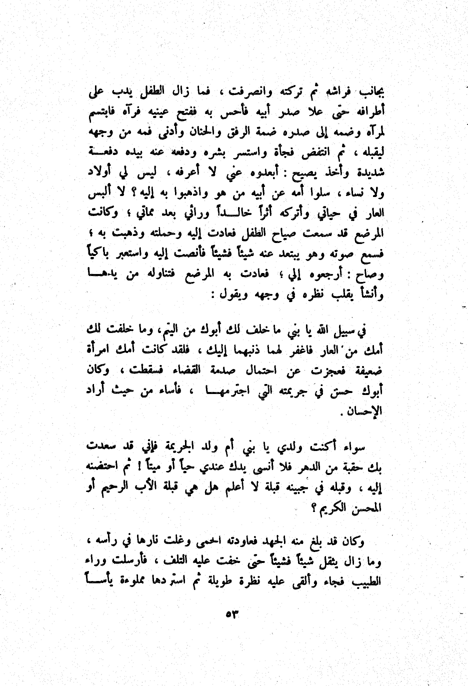 بِجَانِب فِرَاشه ثُمَّ تَرَكْته وَانْصَرَفْت فَمَا زَالَ اَلطِّفْل يَدِبّ عَلَى أَطْرَافه حَتَّى عَلَا صَدْر أَبِيهِ فَأَحَسَّ بِهِ فَفَتَحَ عَيْنَيْهِ فَرَآهُ فَابْتَسَمَ لِمَرْآهُ وَضَمّه إِلَى صَدْره ضَمَّة اَلرِّفْق وَالْحَنَان وَأَدْنَى فَمه مِنْ وَجْهه لِيَقْبَلهُ ثُمَّ اِنْتَفَضَ فَجْأَة واستسر بِشَرِّهِ وَدَفْعه عَنْهُ بِيَدِهِ دَفْعَة شَدِيدَة وَأَخْذ يَصِيح أَبْعَدُوهُ عَنِّي لَا أَعْرِفهُ لَيْسَ لِي أَوْلَاد وَلَا نِسَاء سَلُوا أُمّه عَنْ أَبِيهِ مَنْ هُوَ وَاذْهَبُوا بِهِ إِلَيْهِ ? لَا أَلْبَس اَلْعَار فِي حَيَاتِي وَأَتْرُكهُ أَثَرًا خَالِدًا وَرَائِي بَعْد مَمَاتِي وَكَانَتْ اَلْمُرْضِع قَدْ سَمِعَتْ صِيَاح اَلطِّفْل فَعَادَتْ إِلَيْهِ وَحَمَّلَتْهُ وَذَهَبَتْ بِهِ فَسَمْع صَوْته وَهُوَ يَبْتَعِد عَنْهُ شَيْئًا فَشَيْئًا فَأَنْصَتَ إِلَيْهِ واستعبر بَاكِيًا وَصَاحَ اِرْجِعُوهُ إِلَيَّ فَعَادَتْ بِهِ اَلْمُرْضِع فَتَنَاوَلَهُ مِنْ يَدهَا وَأَنْشَأَ يَقْلِب نَظَره فِي وَجْهه وَيَقُول:
