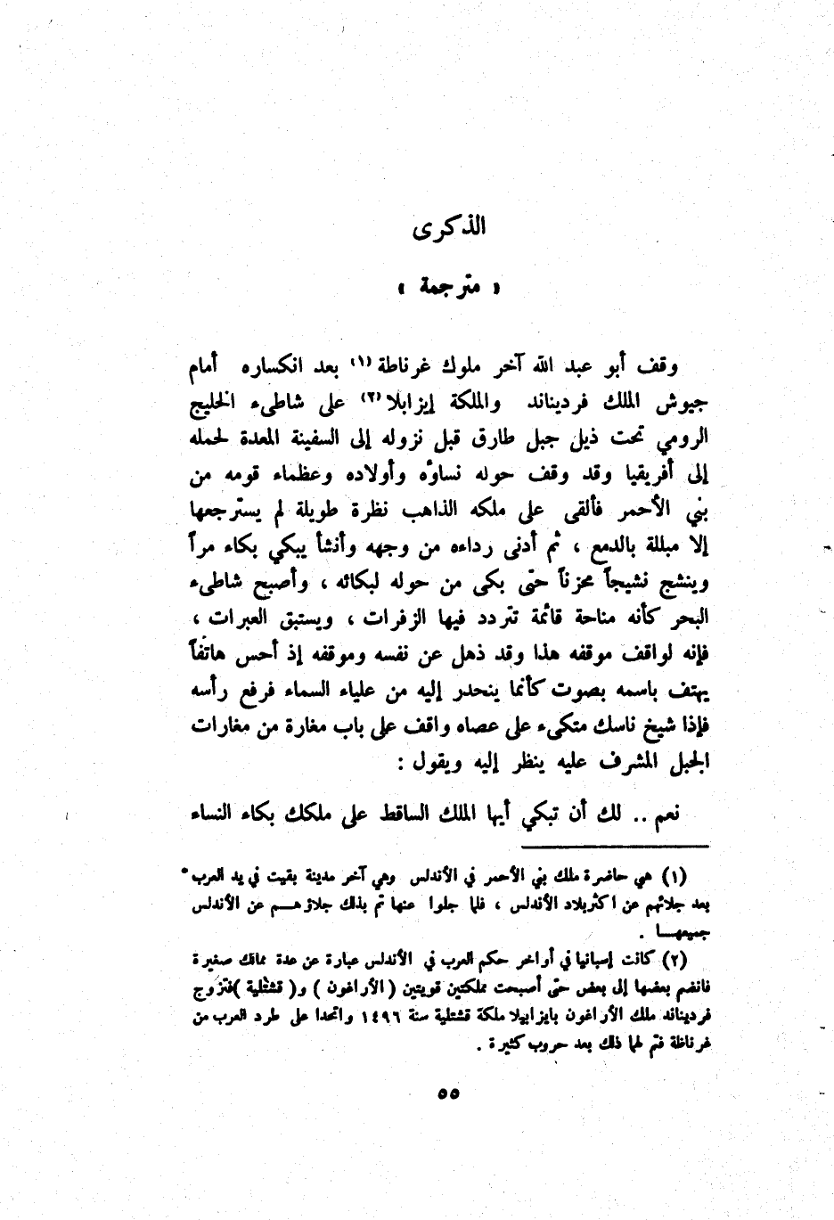 وَقَفَ أَبُو عَبْد اَللَّه آخَر مُلُوك غَرْنَاطَة بَعْد اِنْكِسَاره أَمَام جُيُوش اَلْمَلِك فردينايد وَالْمَلِكَة إيزابلا عَلَى شَاطِئ اَلْخَلِيج اَلرُّومِيّ تَحْت ذَيْل جَبَل طَارِق قَبْل نُزُوله إِلَى اَلسَّفِينَة اَلْمُعَدَّة لِحَمْلِهِ إِلَى أَفْرِيقْيَا وَقَدْ وَقَفَ حَوْله نِسَاؤُهُ وَأَوْلَاده وَعُظَمَاء قَوْمه مِنْ بَنِي اَلْأَحْمَر فَأَلْقَى عَلَى مِلْكه اَلذَّاهِب نَظْرَة طَوِيلَة لَمْ يَسْتَرْجِعهَا إِلَّا مُبَلَّلَة بِالدَّمْعِ ثُمَّ أَدْنَى رِدَاءَهُ مَنْ وَجَّهَهُ وَأَنْشَأَ يَبْكِي بُكَاء مُرًّا وينشج نَشِيجًا مُحْزِنًا حَتَّى بَكَى مِنْ حَوْله لِبُكَائِهِ وَأَصْبَحَ شَاطِئ اَلْبَحْر كَأَنَّهُ مَنَاحَة قَائِمَة تَتَرَدَّد فِيهَا اَلزَّفَرَات وَيَسْتَبِق اَلْعَبَرَات فَإِنَّهُ لِوَاقِف مَوْقِفه هَذَا وَقَدْ ذُهِلَ عَنْ نَفْسه وَمَوْقِفه إِذْ أَحَسَّ هَاتِفًا يَهْتِف بِاسْمِهِ بِصَوْت كَأَنَّمَا يَنْحَدِر إِلَيْهِ مِنْ عَلْيَاء اَلسَّمَاء فَرَفَعَ رَأْسه فَإِذَا شَيْخ نَاسِك مُتَّكِئ عَلَى عَصَاهُ وَاقِف عَلَى بَاب مَغَارَة مِنْ مَغَارَات اَلْجَبَل اَلْمُشْرِف عَلَيْهِ يَنْظُر إِلَيْهِ وَيَقُول: