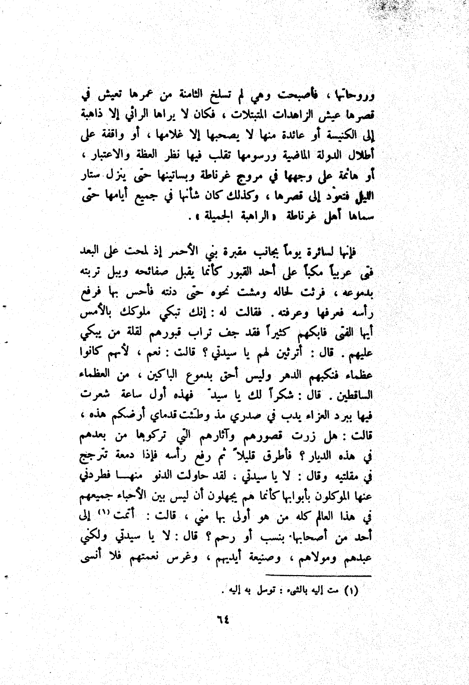 فَإِنَّهَا لِسَائِرَة يَوْمًا بِجَانِب مَقْبَرَة بَنِي اَلْأَحْمَر إِذْ لَمَحَتْ عَلَى اَلْبُعْد فَتَى عَرَبِيًّا مُكِبًّا عَلَى أَحَد اَلْقُبُور كَأَنَّمَا يُقْبَل صَفَائِحه وَيُبْلَ تُرْبَته بِدُمُوعِهِ فَرَثَتْ لِحَالِهِ وَمَشَتْ نَحْوه حَتَّى دَنَتْهُ فَأَحَسَّ بِهَا فَرَفَعَ رَأْسه فَعَرَفَهَا وَعَرَفَتْهُ فَقَالَتْ لَهُ إِنَّك تَبْكِي مُلُوكك بِالْأَمْسِ أَيُّهَا اَلْفَتِيّ فابكهم كَثِيرًا فَقَدْ جَفَّ تُرَاب قُبُورهمْ لِقِلَّة مِنْ يَبْكِي عَلَيْهِمْ قَالَ أترثين لَهُمْ يَا سَيِّدَتِي قَالَتْ نَعَمْ لِأَنَّهُمْ كَانُوا عُظَمَاء فَنَكَبَهُمْ اَلدَّهْر وَلَيْسَ أَحَقّ بِدُمُوع اَلْبَاكِينَ مِنْ اَلْعُظَمَاء اَلسَّاقِطِينَ قَالَ شُكْرًا لَك يَا سَيِّد فَهَذِهِ أَوَّل سَاعَة شَعَرَتْ فِيهَا بِبَرْد اَلْعَزَاء يَدِبّ فِي صَدْرِي مُنْذُ وَطِئَتْ قَدَمَايَ أَرْضكُمْ هَذِهِ قَالَتْ هَلْ زُرْت قُصُورهمْ وَآثَارهمْ اَلَّتِي تَرَكُوهَا مَنْ بَعَّدَهُمْ فِي هَذِهِ اَلدِّيَار فَأَطْرَقَ قَلِيلًا ثُمَّ رَفَعَ رَأْسه فَإِذَا دَمْعَة تَتَرَجْرَج فِي مُقْلَتَيْهِ وَقَالَ لَا يَا سَيِّدَتِي لَقَدْ حَاوَلَتْ اَلدُّنُوّ مِنْهَا فَطَرَدَنِي عَنْهَا اَلْمُوَكَّلُونَ بِأَبْوَابِهَا كَأَنَّمَا هُمْ يَجْهَلُونَ أَنْ لَيْسَ بَيْن اَلْأَحْيَاء جَمِيعهمْ فِي هَذَا اَلْعَالَم كُلّه مِنْ هُوَ أَوْلَى بِهَا مِنِّي قَالَتْ أَتَمَّتْ إِلَيَّ أَحَد مِنْ أَصْحَابهَا بِنَسَب أَوْ رَحِم قَالَ لَا يَا سَيِّدَتِي وَلَكِنِّي عَبْدهمْ وَمَوْلَاهُمْ وصنيعة أَيْدِيهمْ وَغَرْس نِعْمَتهمْ فَلَا أَنْسَى