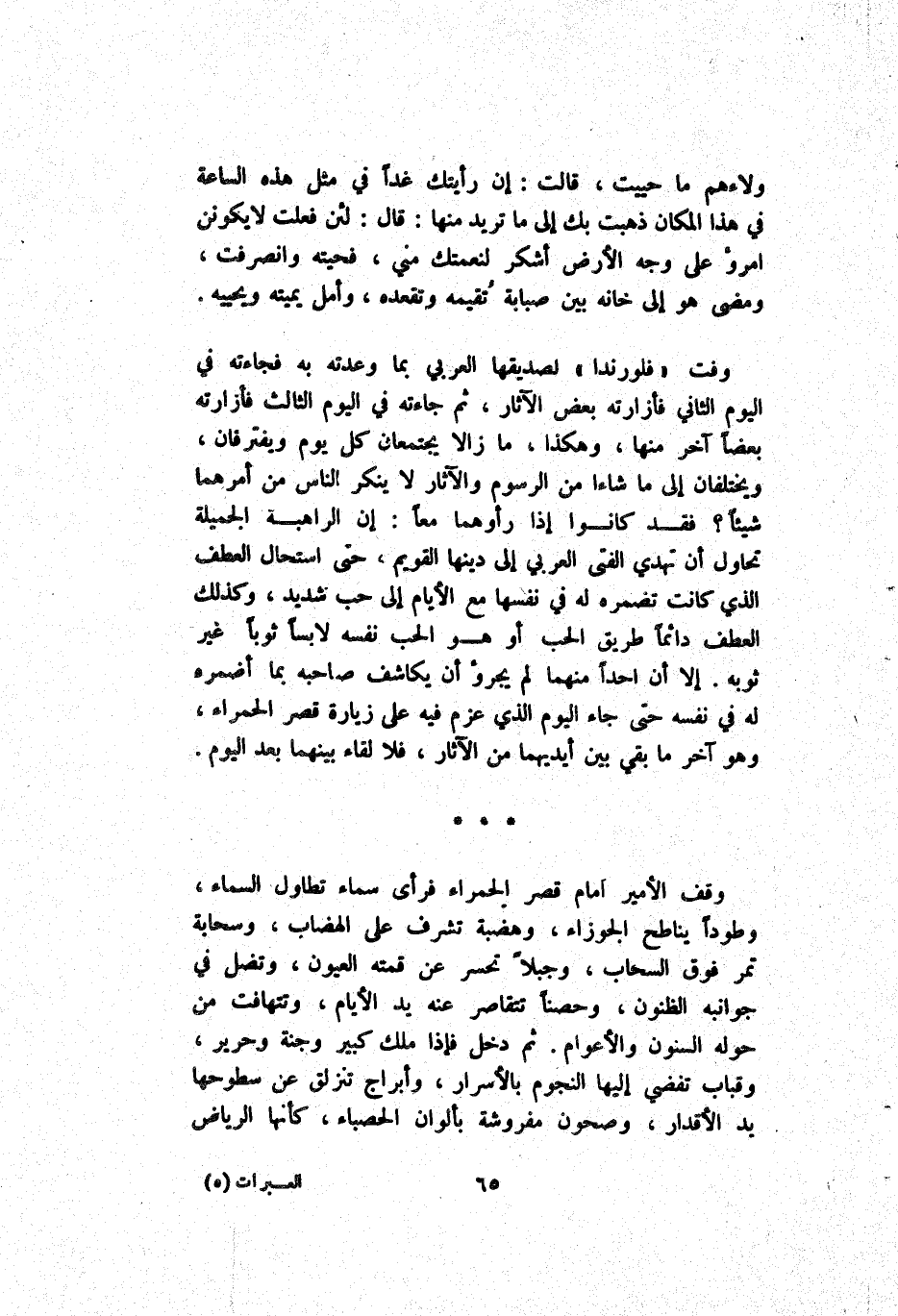 وَفَتْ فلورندا لِصَدِيقِهَا اَلْعَرَبِيّ بِمَا وَعَدَتْهُ بِهِ فَجَاءَتْهُ فِي اَلْيَوْم اَلثَّانِي فأزارته بَعْض اَلْآثَار ثُمَّ جَاءَتْهُ فِي لِيَوْم اَلثَّالِث فأزارته بَعْضًا آخَر مِنْهَا وَهَكَذَا مَا زَالَا يَجْتَمِعَانِ كُلّ يَوْم وَيَفْتَرِقَانِ وَيَخْتَلِفَانِ إِلَى مَا شَاءَ مِنْ اَلرُّسُوم وَالْآثَار لَا يُنْكِر اَلنَّاس مِنْ أَمْرهمَا شَيْئًا فَقَدْ كَانُوا إِذَا رَأَوْهُمَا مَعًا إِنَّ اَلرَّاهِبَة اَلْجَمِيلَة تُحَاوِل أَنَّ تَهْدِيد اَلْفَتِيّ اَلْعَرَبِيّ إِلَى دِينهَا اَلْقَوِيم حَتَّى اِسْتَحَالَ اَلْعَطْف اَلَّذِي كَانَتْ تُضْمِرهُ لَهُ فِي نَفْسهَا مَعَ اَلْأَيَّام إِلَى حُبّ شَدِيد وَكَذَلِكَ اَلْعَطْف دَائِمًا طَرِيق اَلْحُبّ أَوْ هُوَ اَلْحُبّ نَفْسه لَابِسًا ثَوْبًا غَيْر ثَوْبه إِلَّا أَنَّ أَحَدًا مِنْهُمَا لَمْ يَجْرُؤ أَنْ يُكَاشِف صَاحِبه بِمَا أُضْمِرهُ لَهُ فِي نَفْسه حَتَّى جَاءَ اَلْيَوْم اَلَّذِي عَزَمَ فِيهِ عَلَى زِيَادَة قَصْر اَلْحَمْرَاء وَهُوَ آخَر مَا بَقِيَ بَيْن أَيْدِيهمَا مِنْ اَلْآثَار فَلَا لِقَاء بَيْنهمَا بَعْد اَلْيَوْم.