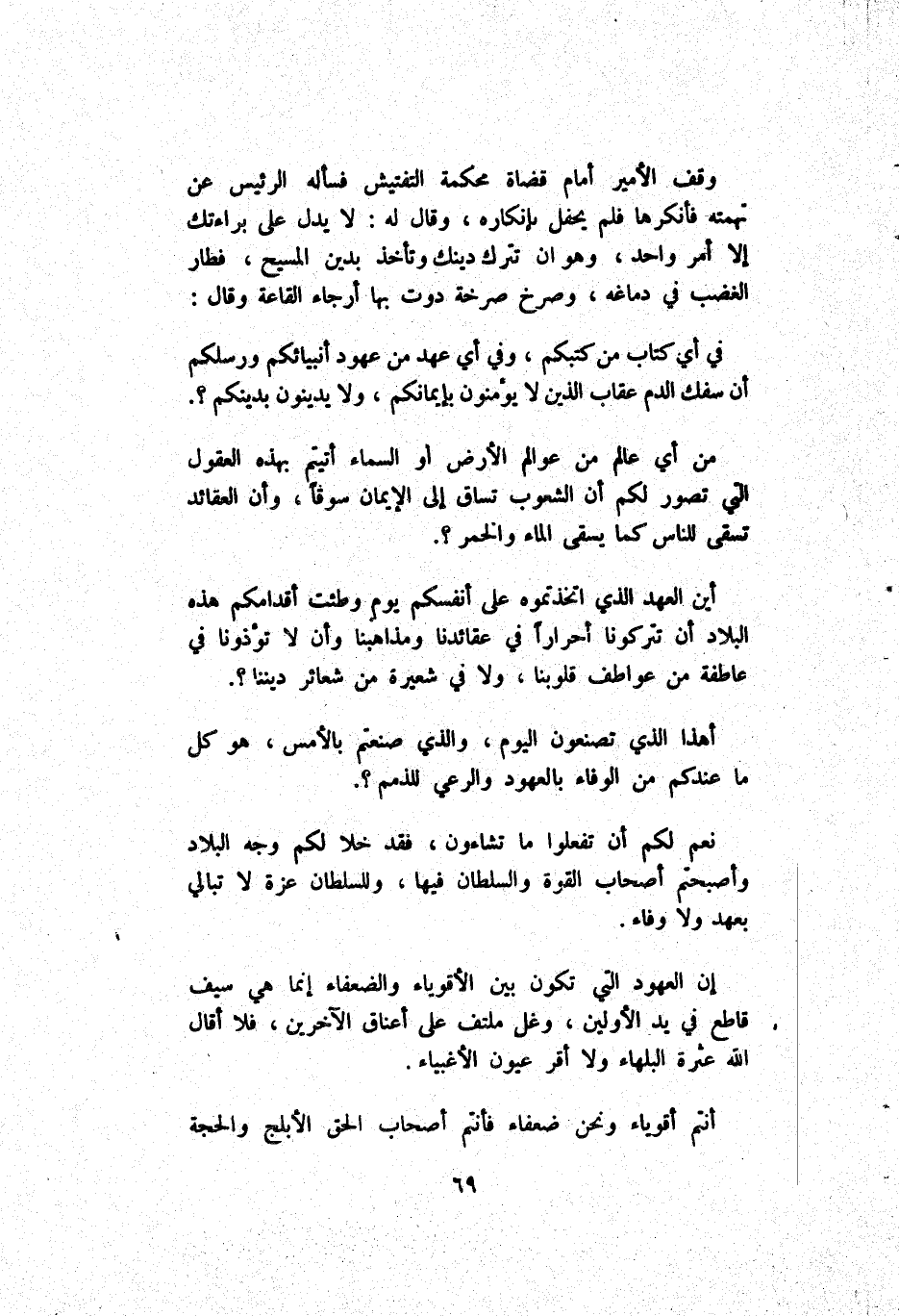 فِي أَيّ كِتَاب مِنْ كُتُبكُمْ وَفِي أَيّ عَهْد مَعْهُود أَنْبِيَائِكُمْ وَرُسُلكُمْ أَنَّ سَفْك اَلدَّم عِقَاب اَلَّذِينَ لَا يُؤْمِنُونَ بِإِيمَانِكُمْ وَلَا يَدِينُونَ بِدِينِكُمْ ? مَنْ أَيّ عَالِم مِنْ عَوَالِم اَلْأَرْض أَوْ اَلسَّمَاء أَتَيْتُمْ بِهَذِهِ اَلْعُقُول اَلَّتِي تُصَوِّر لَكُمْ أَنَّ اَلشُّعُوب تُسَاق إِلَى اَلْإِيمَان سُوقًا وَأَنَّ اَلْعَقَائِد تُسْقَى لِلنَّاسِ كَمَا يُسْقَى اَلْمَاء وَالْخَمْر ? أَيْنَ اَلْعَهْد اَلَّذِي اِتَّخَذْتُمُوهُ عَلَى أَنْفُسكُمْ يَوْم وَطِئَتْ أَقْدَامكُمْ هَذِهِ اَلْبِلَاد أَنْ تَتْرُكُونَا أَحْرَارًا فِي عَقَائِدنَا وَمَذَاهِبنَا وَأَنْ لَا تُؤْذُونَا فِي عَاطِفَة مِنْ عَوَاطِف قُلُوبنَا وَلَا فِي شَعِيرَة مِنْ شَعَائِر دِيننَا ? أهذا اَلَّذِي تَصْنَعُونَ اَلْيَوْم وَاَلَّذِي صَنَعْتُمْ بِالْأَمْسِ هُوَ كُلّ مَا عِنْدكُمْ مِنْ اَلْوَفَاء بِالْعُهُودِ وَالرَّعْي لِلذِّمَمِ ? نَعِمَ لَكُمْ أَنْ تَفْعَلُوا مَا تَشَاءُونَ فَقَدْ خَلَا لَكُمْ وَجْه اَلْبِلَاد وَأَصْبَحْتُمْ اَلْقُوَّة وَالسُّلْطَان فِيهَا وَلِلسُّلْطَانِ عِزَّة وَلَا تُبَالِي بِعَهْد وَلَا وَفَاء.