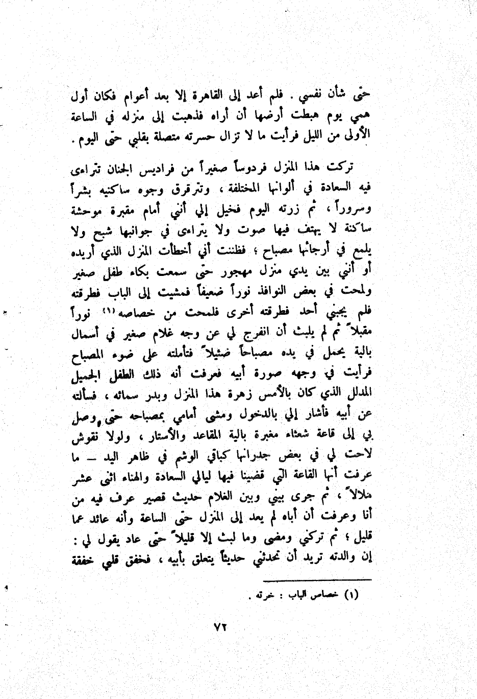 حَتَّى شَأْن نَفْسِيّ فَلَمْ أَعُدْ إِلَى لِقَاهِرَة إِلَّا بَعْد أَعْوَام فَكَانَ أَوَّل هَمِّي يَوْم هَبَطَتْ أَرْضهَا أَنْ أَرَاهُ فَذَهَبَتْ إِلَى مَنْزِله فِي اَلسَّاعَة اَلْأَوْلَى مِنْ اَللَّيْل فَرَأَيْت مَا لَا تَزَال حَسْرَته مُتَّصِلَة بِقَلْبِي حَتَّى اَلْيَوْم.