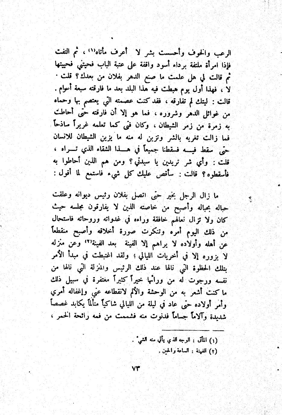 اَلرُّعْب وَالْخَوْف وَأَحْسَسْت بِشَرّ لَا أَعْرِف مأتاه ثُمَّ اِلْتَفَّتْ فَإِذَا اِمْرَأَة مُلْتَفَّة بِرِدَاء أَسْوَد وَاقِفَة عَلَى عَتَبَة اَلْبَاب فَحَيَّتْنِي فحييتها ثُمَّ قَالَتْ لِي هَلْ عَلِمَتْ مَا صَنَعَ اَلدَّهْر بِفُلَان مَنْ بَعَّدَك قُلْت لَا فَهَذَا أَوَّل يَوْم هَبَطَتْ فِيهِ هَذَا اَلْبَلَد بَعْد مَا فَارَقَتْهُ سَبْعَة أَعْوَام قَالَتْ لَيْتَك لَمْ تُفَارِقهُ فَقَدْ كُنْت عِصْمَته اَلَّتِي يَعْتَصِم بِهَا وَحِمَاهُ مِنْ غوائل اَلدَّهْر وَشُرُوره فَمَا هُوَ إِلَّا أَنْ فَارَقَتْهُ حَتَّى أَحَاطَتْ بِهِ زُمْرَة مِنْ زَمْر اَلشَّيْطَان وَكَانَ فَنِّيّ كَمَا تُعَلِّمهُ غريرا سَاذَجًا فَمَا زَالَتْ تُغْرِيه بِالشَّرِّ وَتَرَيْنَ لَهُ مِنْهُ مَا يُزَيِّن اَلشَّيْطَان لِلْإِنْسَانِ حَتَّى سَقَطَ فِيهَا فَسَقَطْنَا جَمِيعًا فِي هَذَا اَلشَّقَاء اَلَّذِي تَرَاهُ قُلْت وَأَيّ شَرّ تُرِيدِينَ يَا سَيِّدَتِي وَمَنْ هُمْ اَلَّذِينَ أَحَاطُوا بِهِ بِالْإِغْوَاءِ قَالَتْ سَأَقُصُّ عَلَيْك كُلّ شَيْء فَاسْتَمِعْ لِمَا أَقُول:
