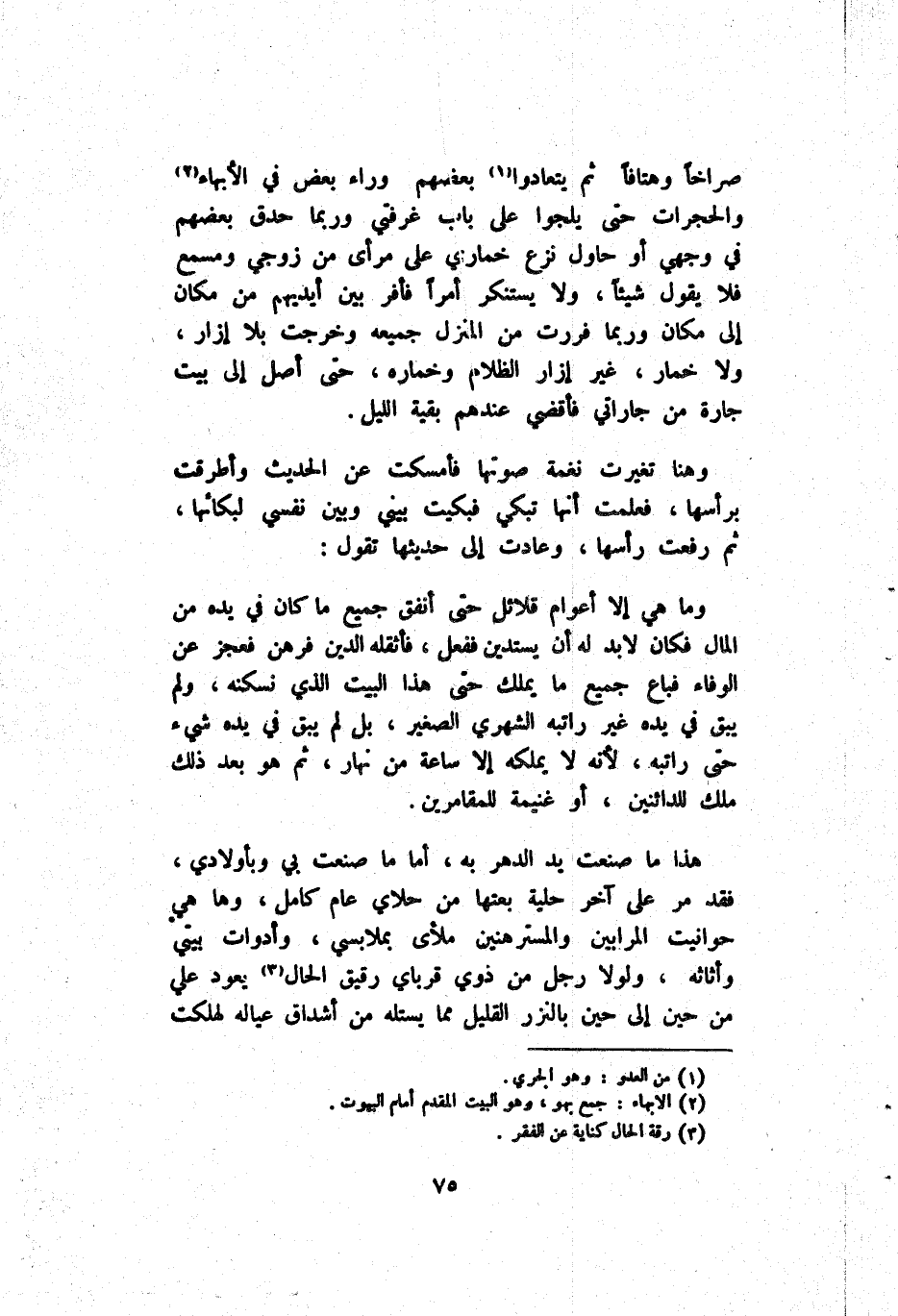 هَذَا مَا صَنَعَتْ يَد اَلدَّهْر بِهِ أَمَّا مَا صَنَعَتْ بِي وَبِأَوْلَادِي فَقَدْ مَرَّ عَلَى آخَر حلية بِعْتهَا مِنْ حَلَّايَ عَام كَامِل وَهَا هِيَ حَوَانِيت اَلْمُرَابِينَ والمسترهنين مَلْأَى بِمَلَابِسِي وَأَدَوَات بَيْتِي وَأَثَاثه وَلَوْلَا رِجْل مِنْ ذَوِي بِالْإِغْوَاءِ رَقِيق اَلْحَال يَعُود عَلَيَّ مِنْ حِين إِلَى حِين بِالنَّزْرِ اَلْقَلِيل مِمَّا يَسْتَلّهُ مِنْ أشداق عِيَاله لَهَلَكَتْ
